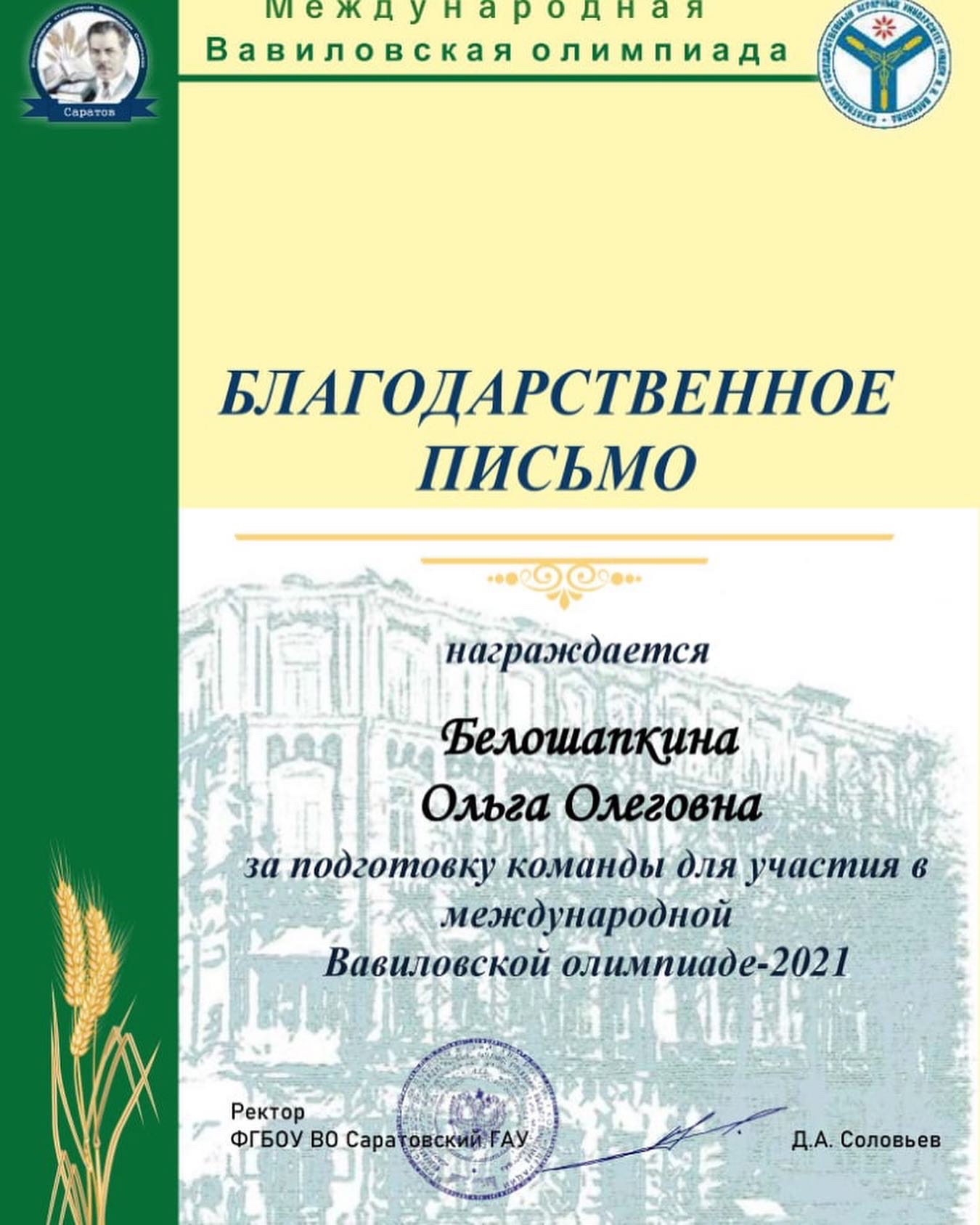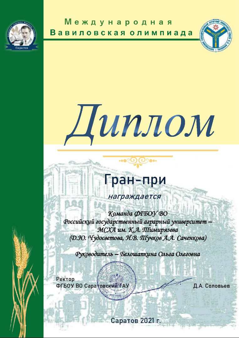 Команда в составе студентов 307-й группы Института агробиотехнологий Д.Ю. Чудосветовой, И.В. Тучкова и А.А. Саченковой под руководством профессора О.О. Белошапкиной получила Гран-при на Международной Вавиловской олимпиаде-2021.