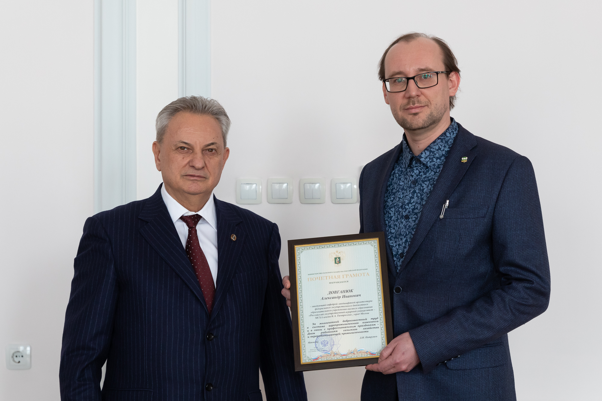 Почетной грамоты Министерства сельского хозяйства Российской Федерации за многолетний добросовестный труд в системе агропромышленного комплекса были удостоены и.о. заведующего кафедрой экономической безопасности, анализа и аудита, кандидат экономических наук, доцент Татьяна Николаевна Гупалова; доцент кафедры ландшафтной архитектуры, кандидат биологических наук Александр Иванович Довганюк; заведующий лабораторией кафедры инжиниринга животноводства Николай Алексеевич Егоров.