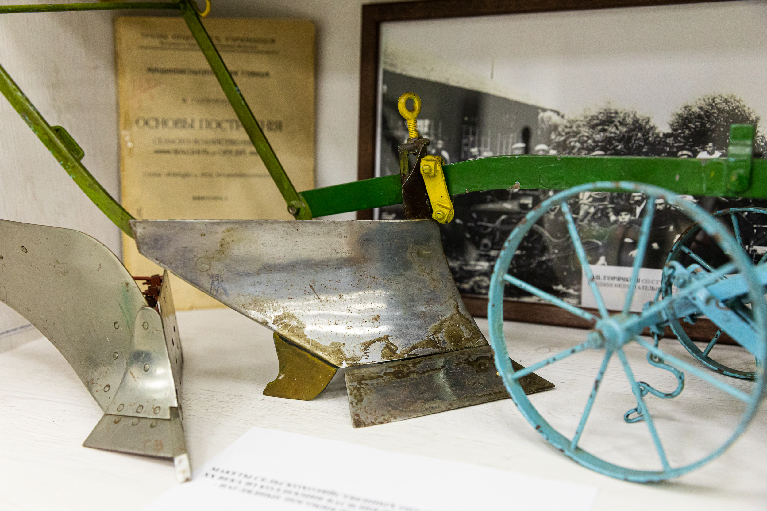 Экспозиция выставки включает уникальные документы и фотографии, макеты ручных плугов, исторические образцы приборов для испытания сельскохозяйственных машин.