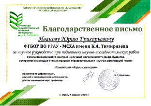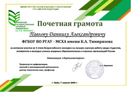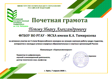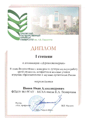 Студент 4-го курса Попов Иван Александрович и магистрант 2-го курса Павлов Даниил Александрович (научный руководитель профессор Иванов Ю.Г.) стали победителями II этапа Всероссийского конкурса на лучшую работу среди студентов, аспирантов и молодых ученых аграрных образовательных и научных организаций России в номинации Агроинженерия.