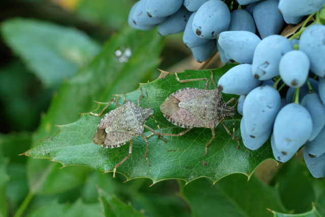 На фото изображены самец и самка вредителя на листе магонии падуболистной. Было установлено, что это североамериканское растение является одним из наиболее предпочитаемых кормовых растений мраморного клопа в условиях Приазовья. Результаты исследования доцент кафедры защиты растений представил в журнале «Бюллетень Европейской и Средиземноморской организации по карантину и защите растений».