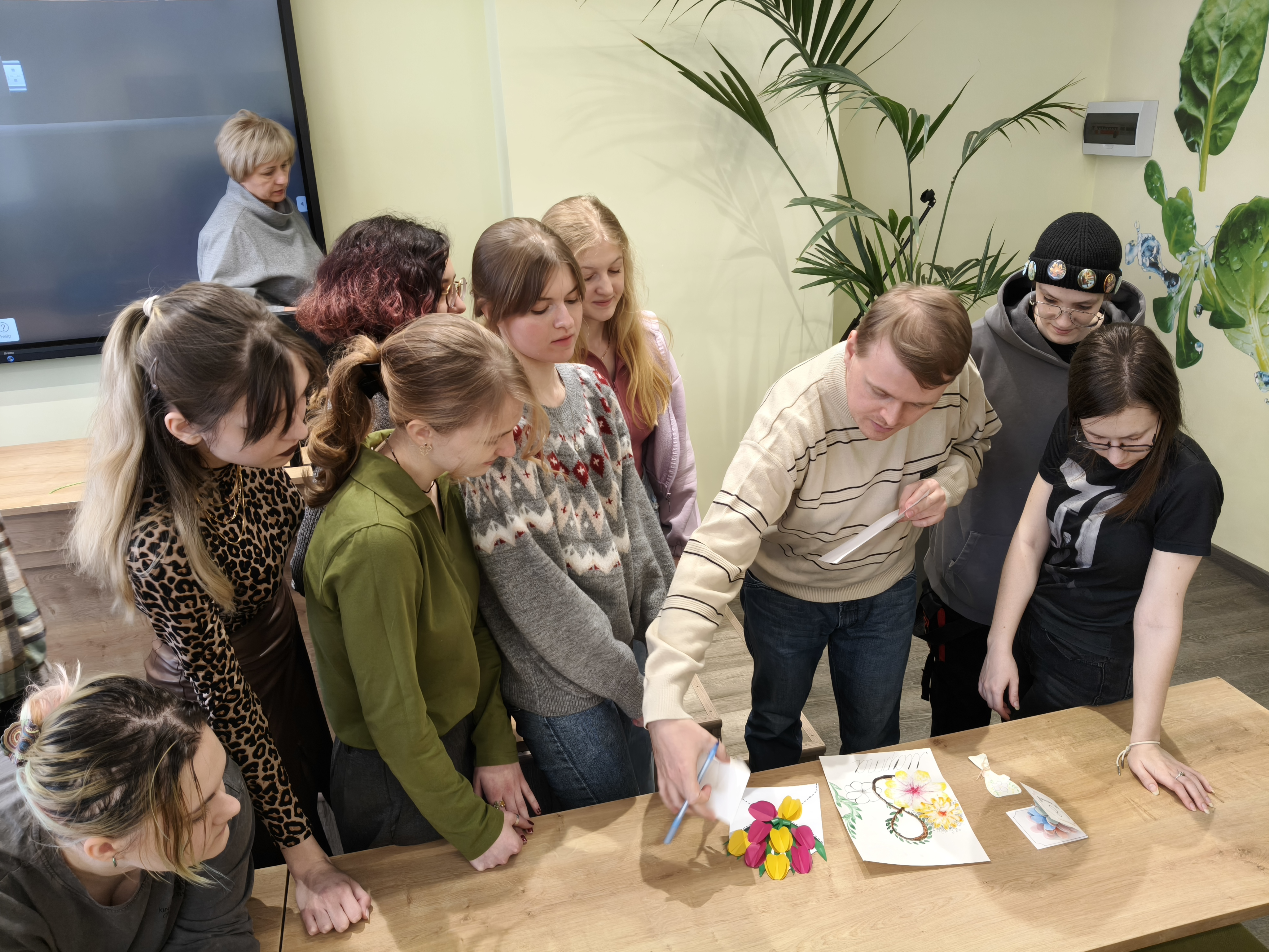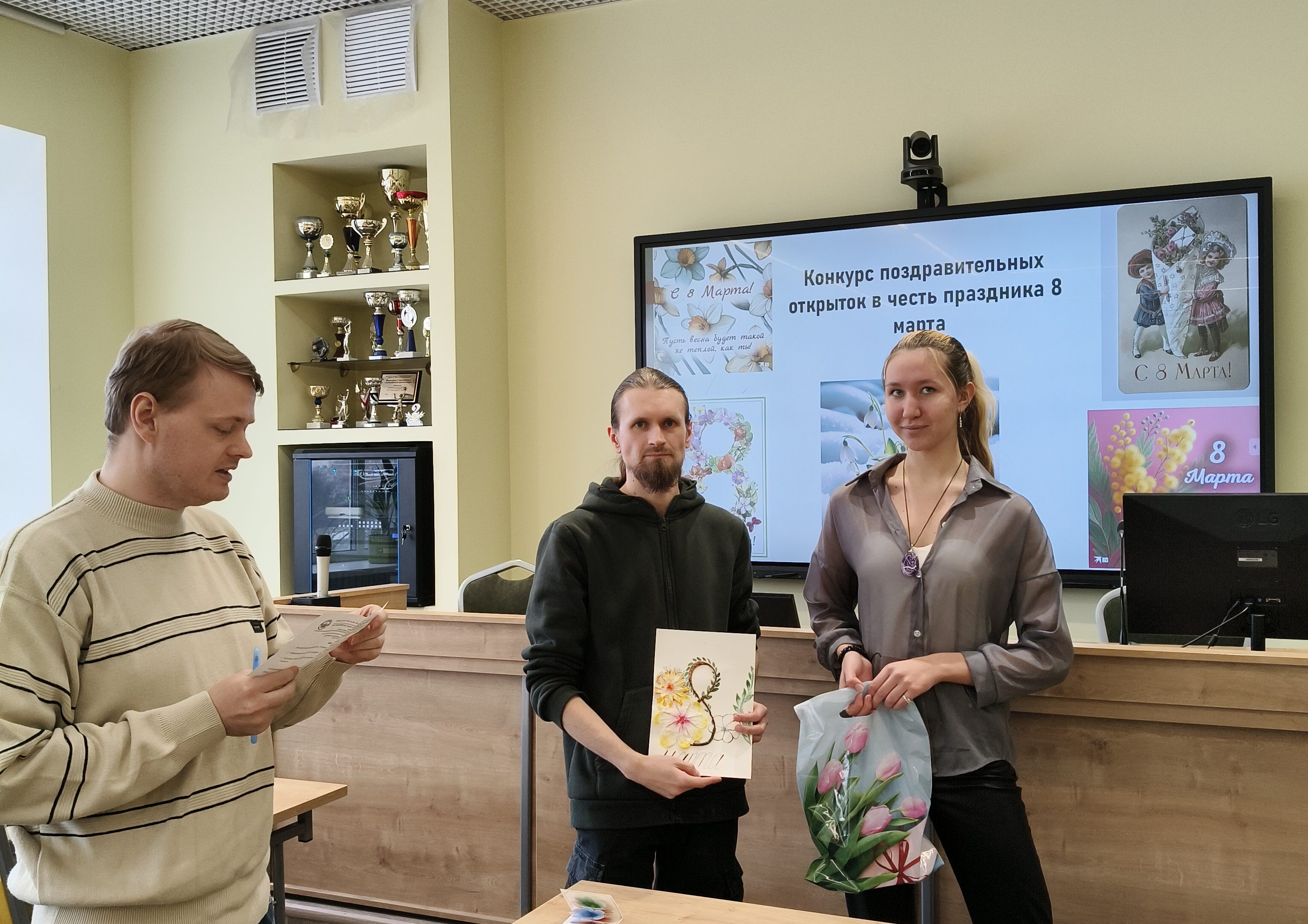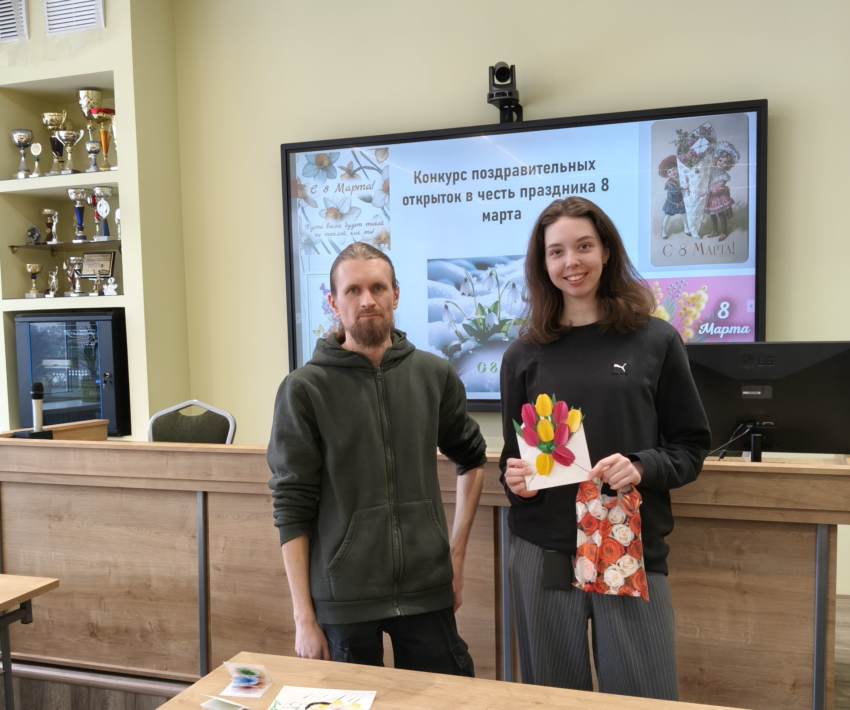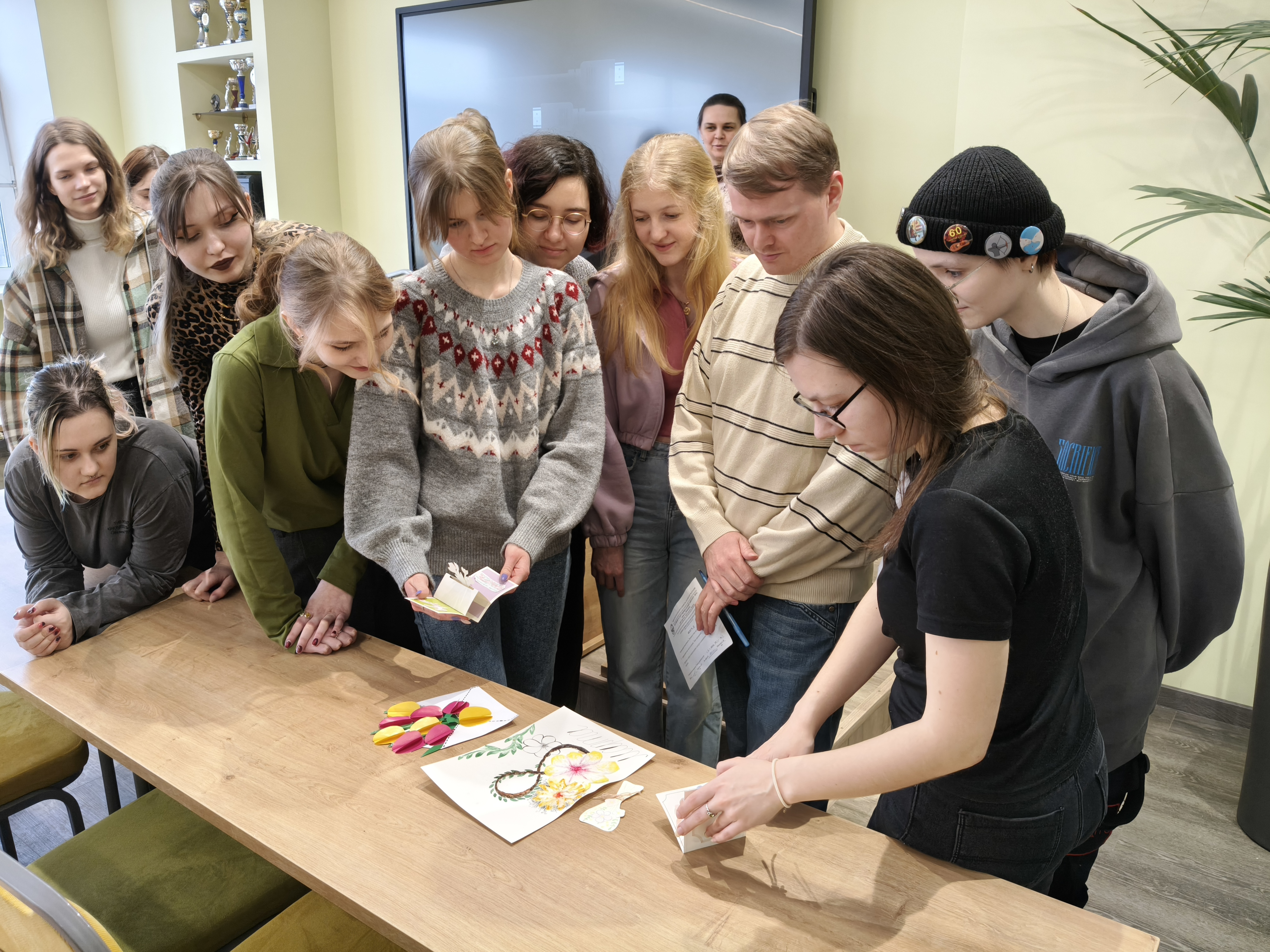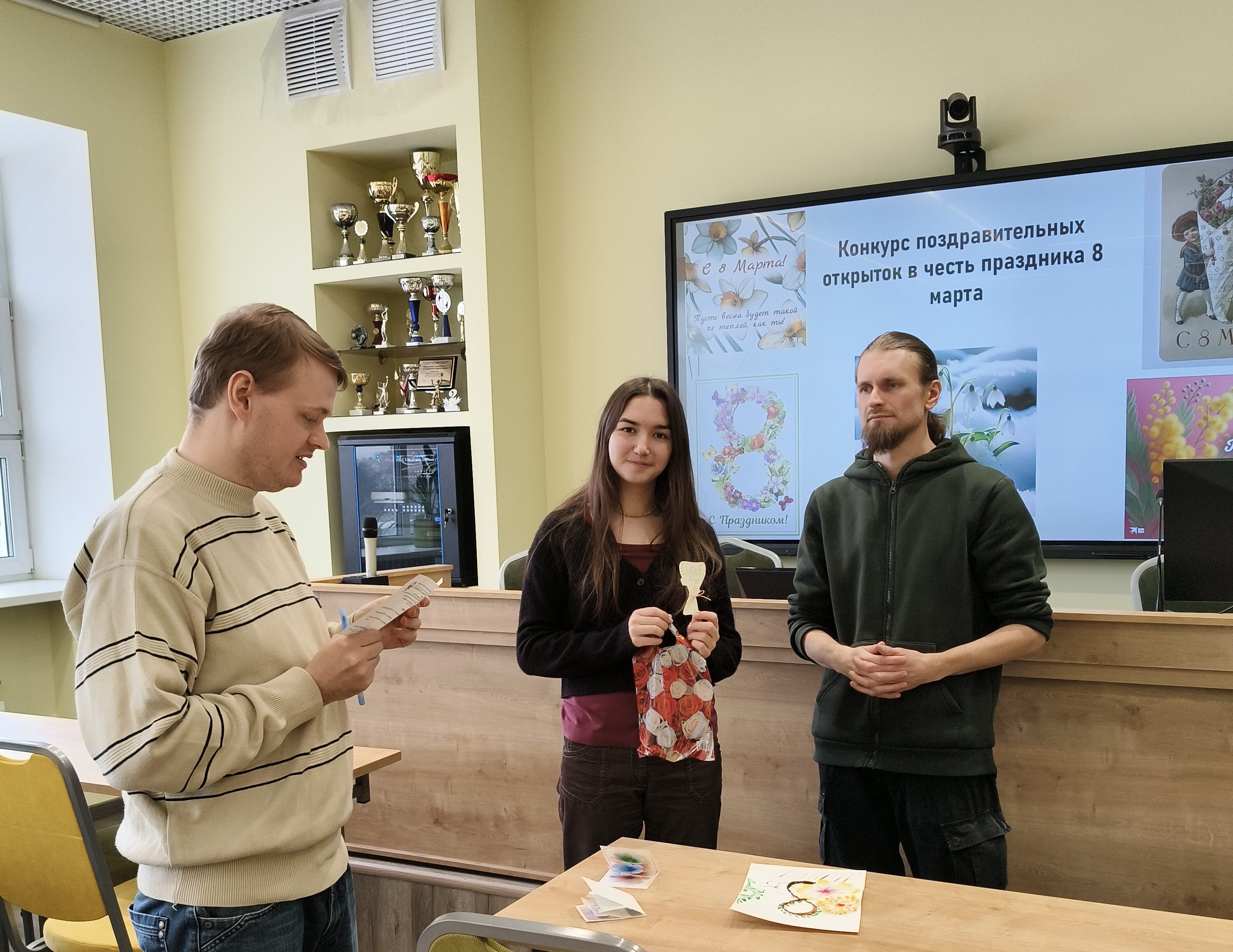 6 марта эстафету празднования подхватила творческая часть программы. Студенты группы Д-С 02-25 стали участниками конкурса поздравительных открыток, посвященных Международному женскому дню. Вдохновленные историей праздника, где еще в советские времена открытки украшали изображениями женщин-ударниц, а позже — весенними пейзажами и цветами, ребята создали свои уникальные работы. Организацию конкурса и кураторство взяли на себя доценты Чудецкий А.И. и Голоктионов И.И.