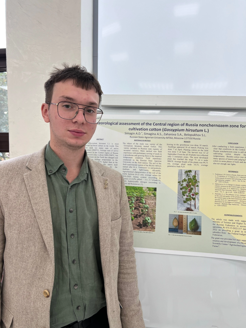 Магистрант кафедры генетики, селекции и семеноводства Александр Симагин выступил с докладом «Агрометеорологическая оценка центрального региона Нечерноземной зоны Российской Федерации для возделывания хлопчатника». В выступлении были затронуты вопросы глобального потепления и интродукции растений в более северные регионы.