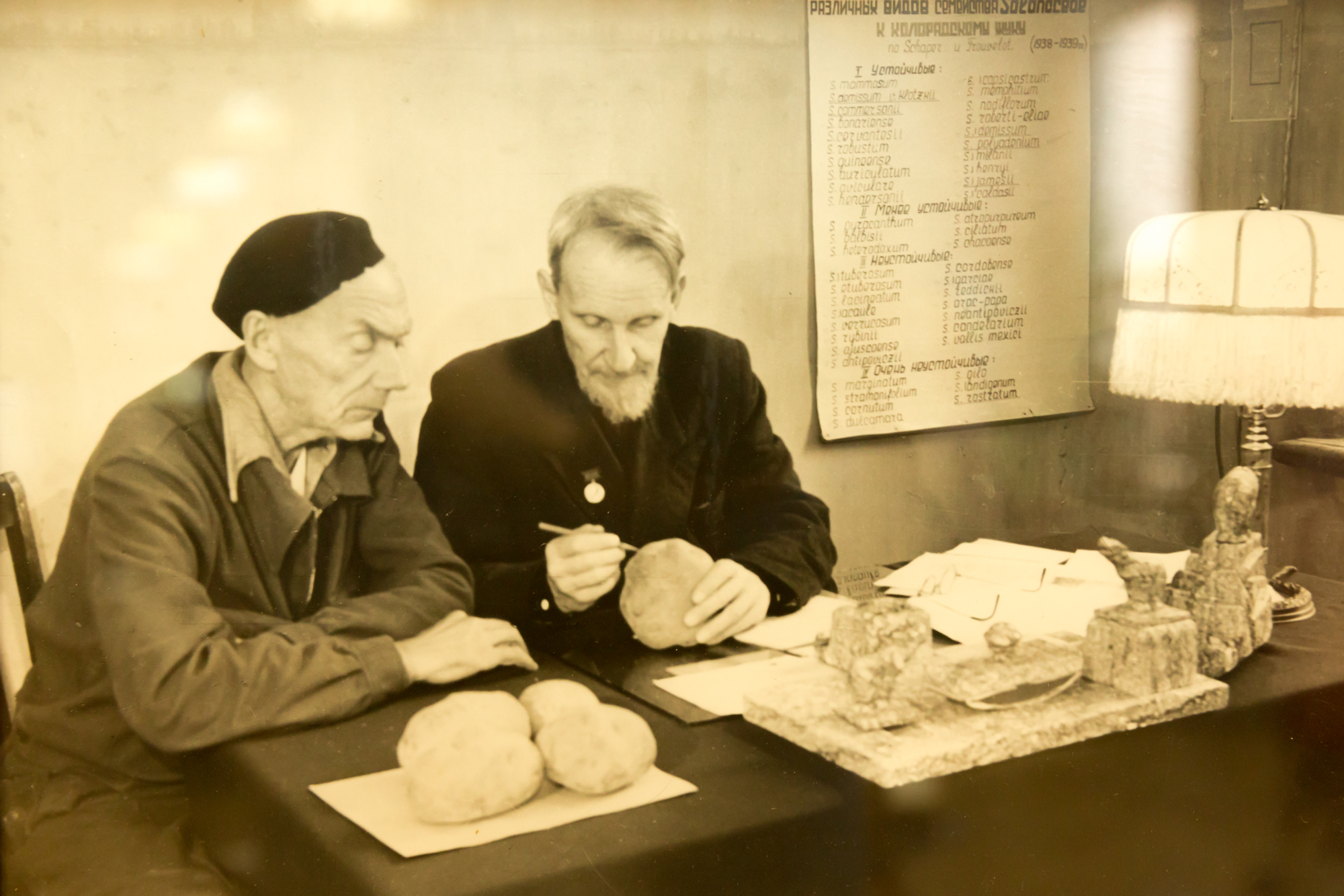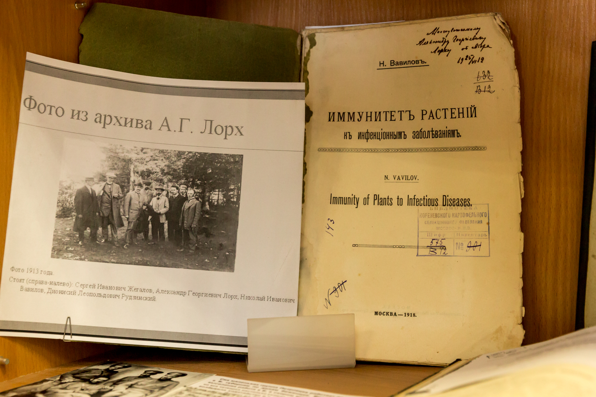 Уникальные документы и фотографии, представленные на стендах выставки, иллюстрируют развитие картофелеводства в России XX века. Вот фото 1913 года. Н.И. Вавилов, Д.Л. Рудзинский, С.И. Жегалов и А.Г. Лорх позируют фотографу. Все они со временем войдут в историю аграрной науки. Вот книга Николая Ивановича Вавилова 1918 года с дарственной надписью, когда-то подаренная А.Г. Лорху – реликвия семьи ученого.