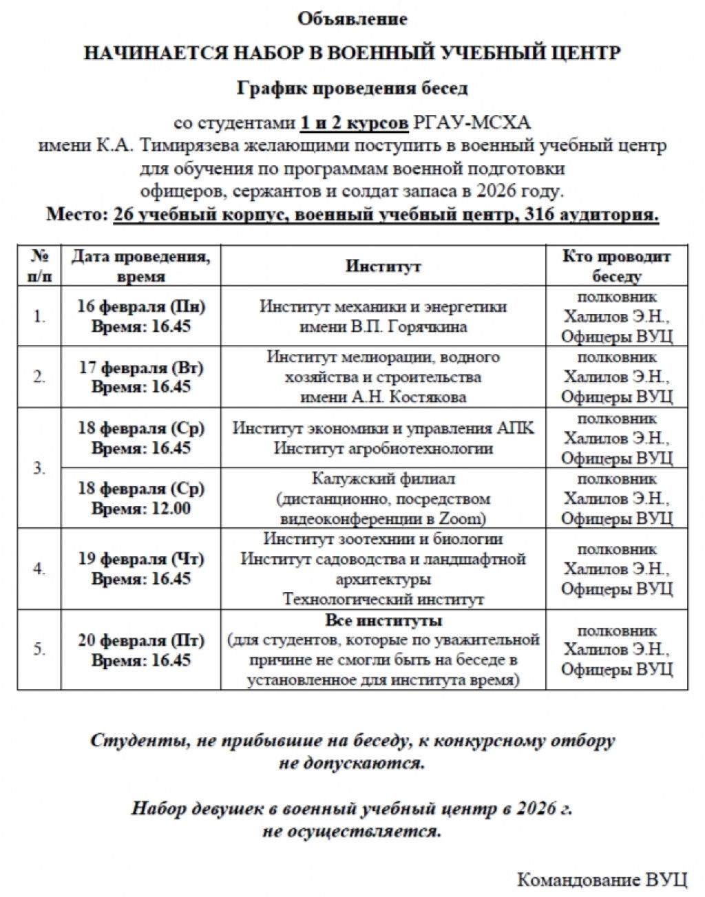 Объявляется набор в Военный учебный центр (ВУЦ) при РГАУ-МСХА имени К.А. Тимирязева на 2026 год. Приглашаем всех студентов, желающих пройти обучение по программам военной подготовки офицеров, сержантов и солдат запаса, принять участие в информационных беседах, организованных сотрудниками ВУЦ.
