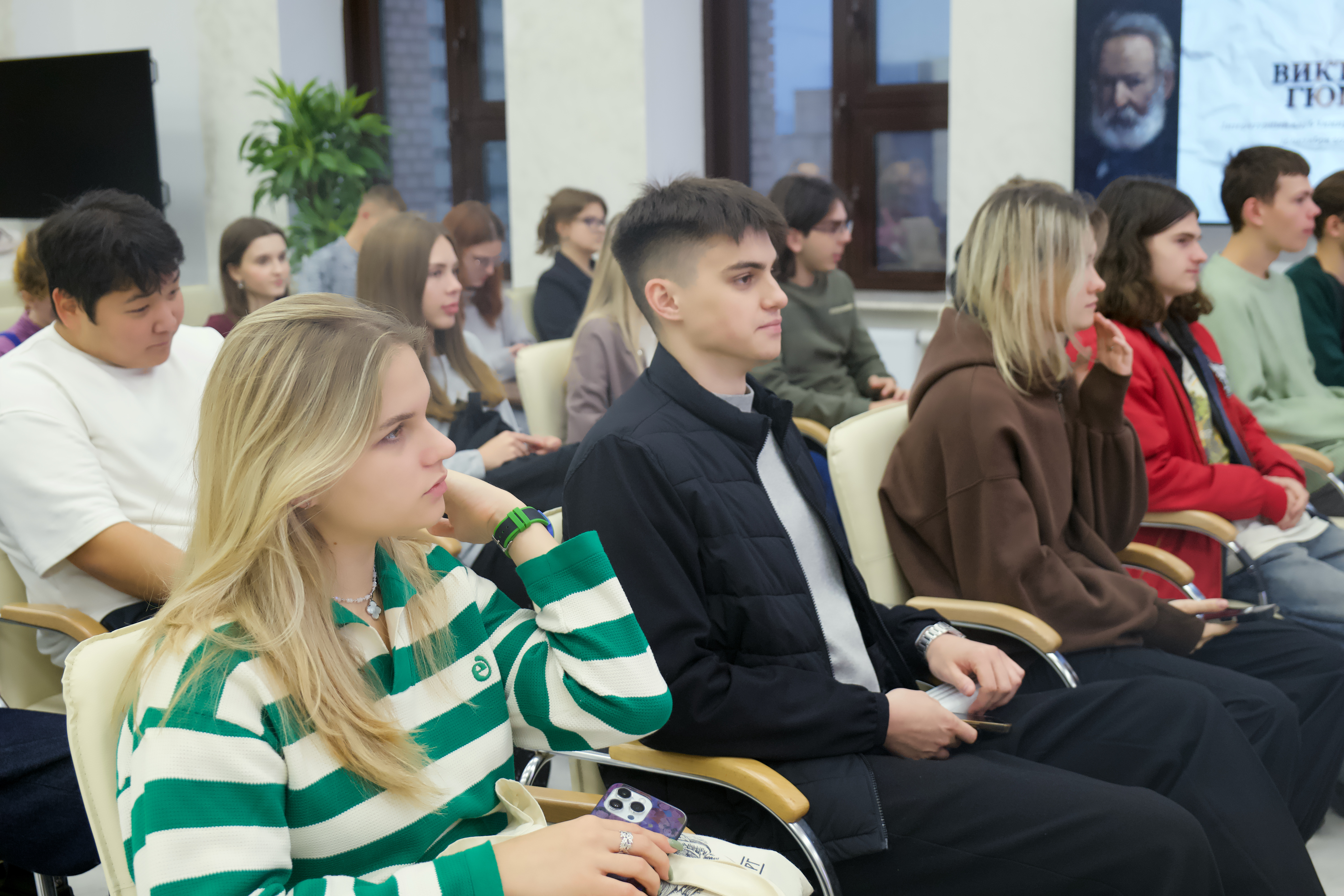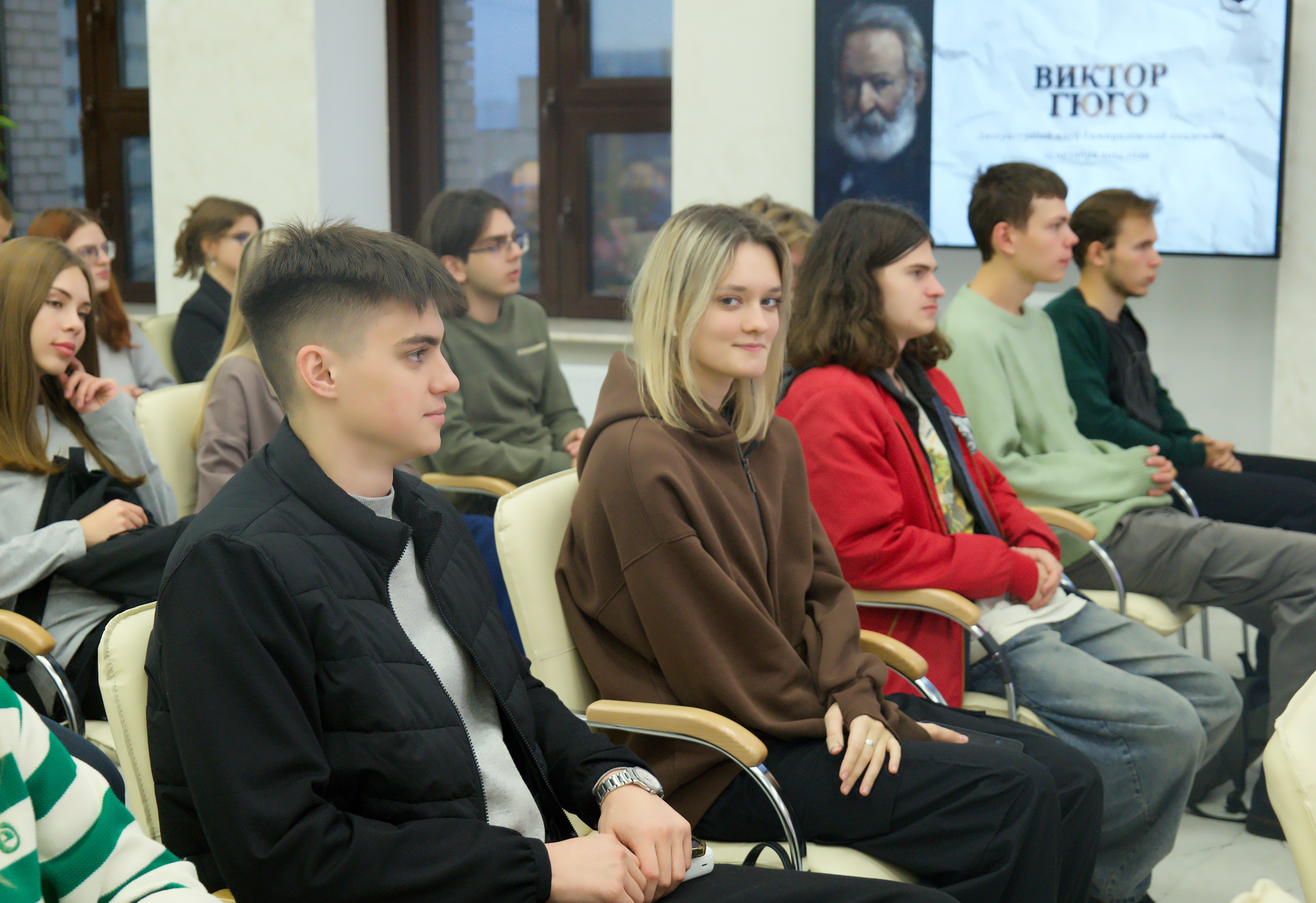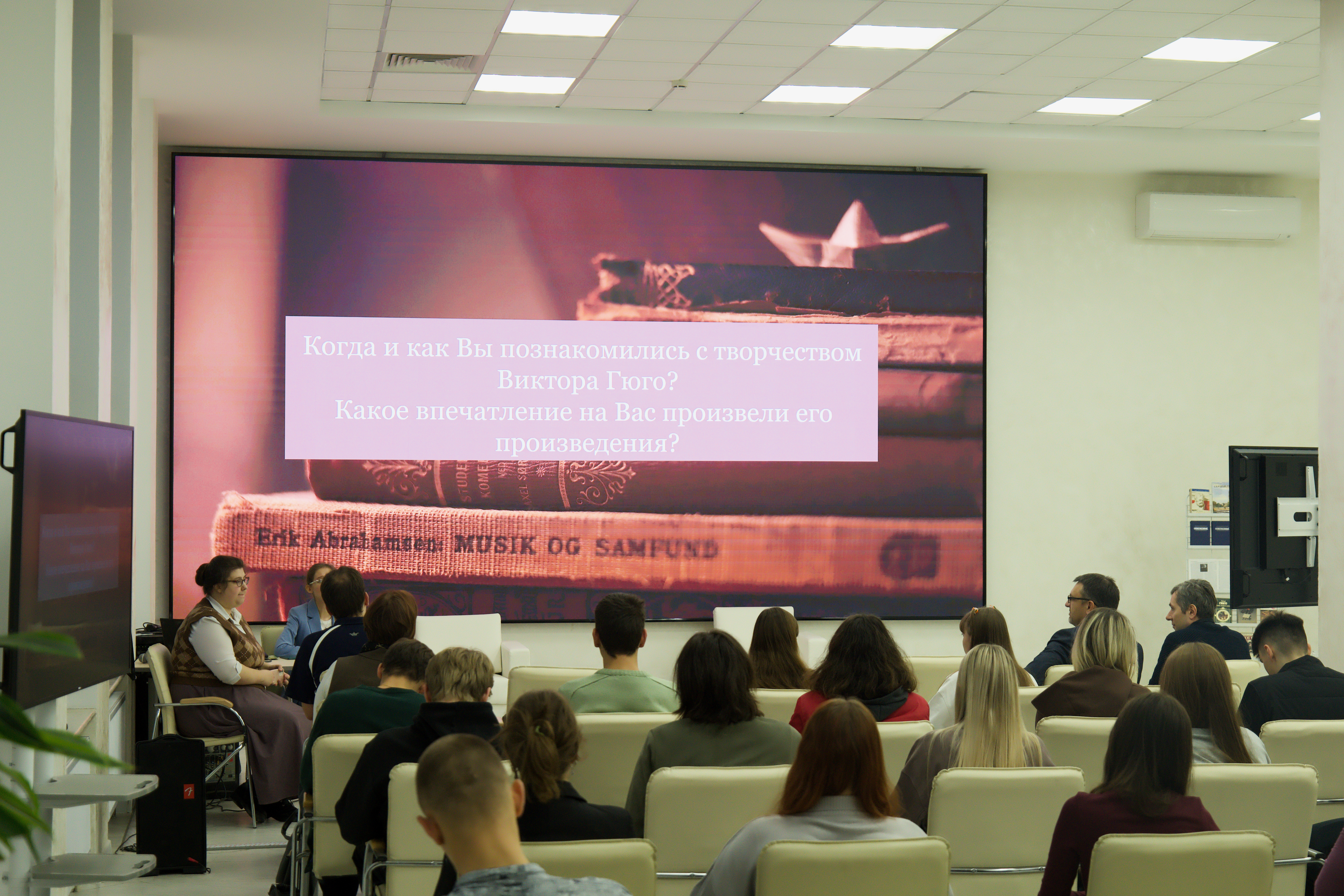Студенты и преподаватели погрузились в атмосферу французского романтизма и Средневековья. Новые и постоянные участники клуба поделились своими впечатлениями и мнениями о произведениях и героях. Отрывок из романа «Человек, который смеётся» был прочитан в оригинале на французском языке и.о. заведующего кафедрой иностранных и русского языков Зайцевым А.А. Встреча завершилась просмотром киноадаптаций «Собора Парижской Богоматери». Также в библиотеке представлена выставка с книгами Гюго из библиотечного фонда.
