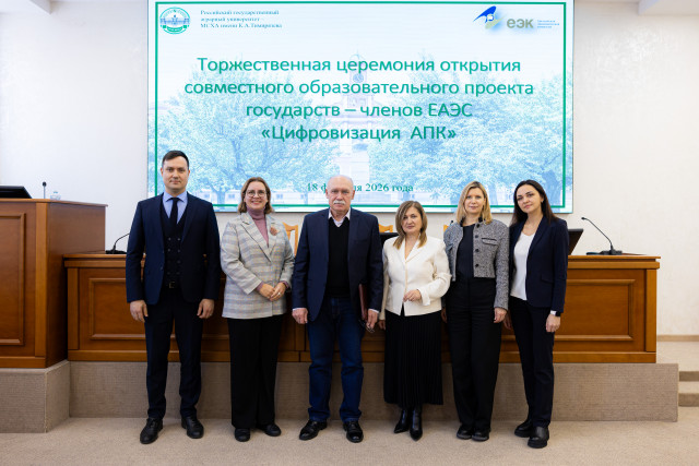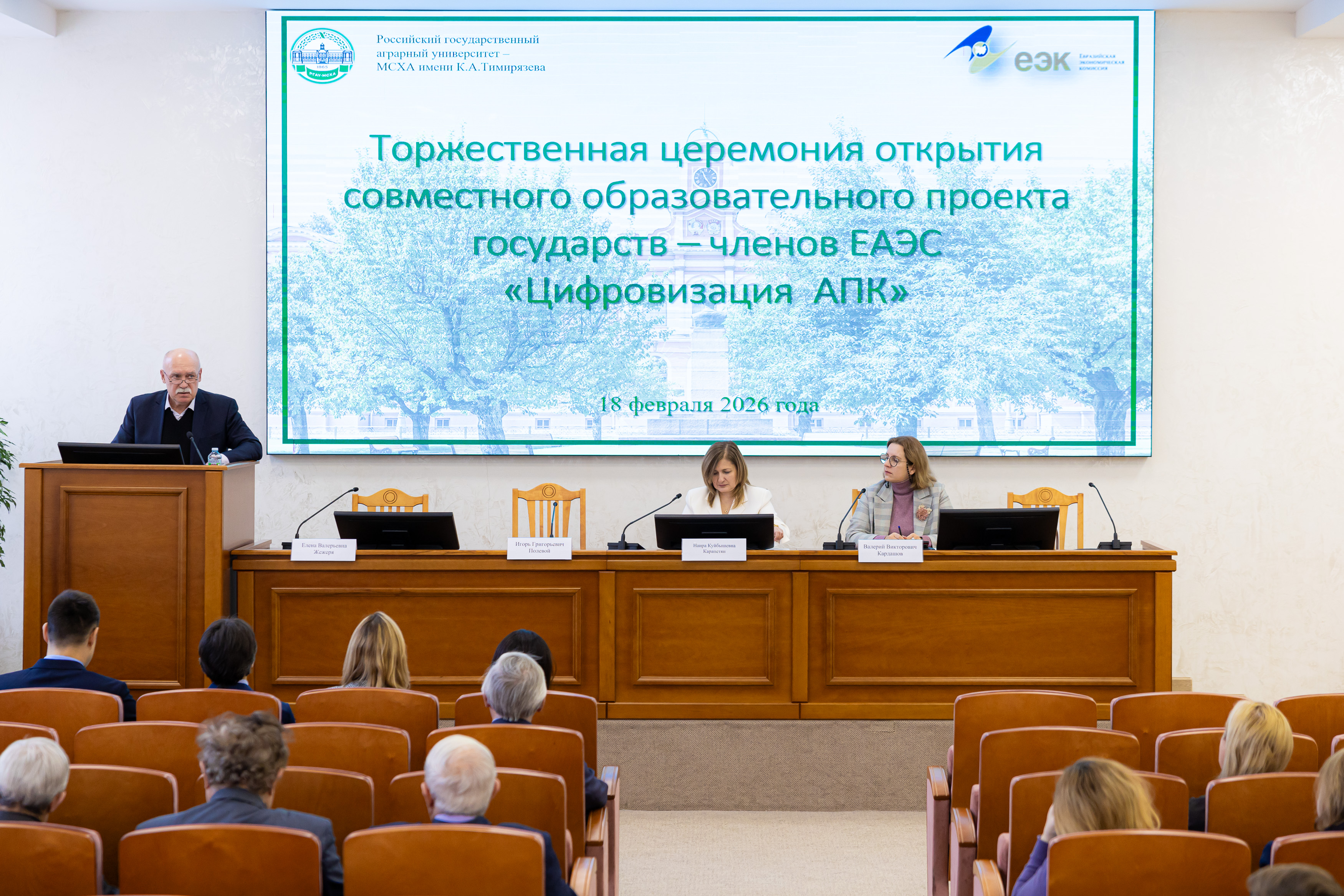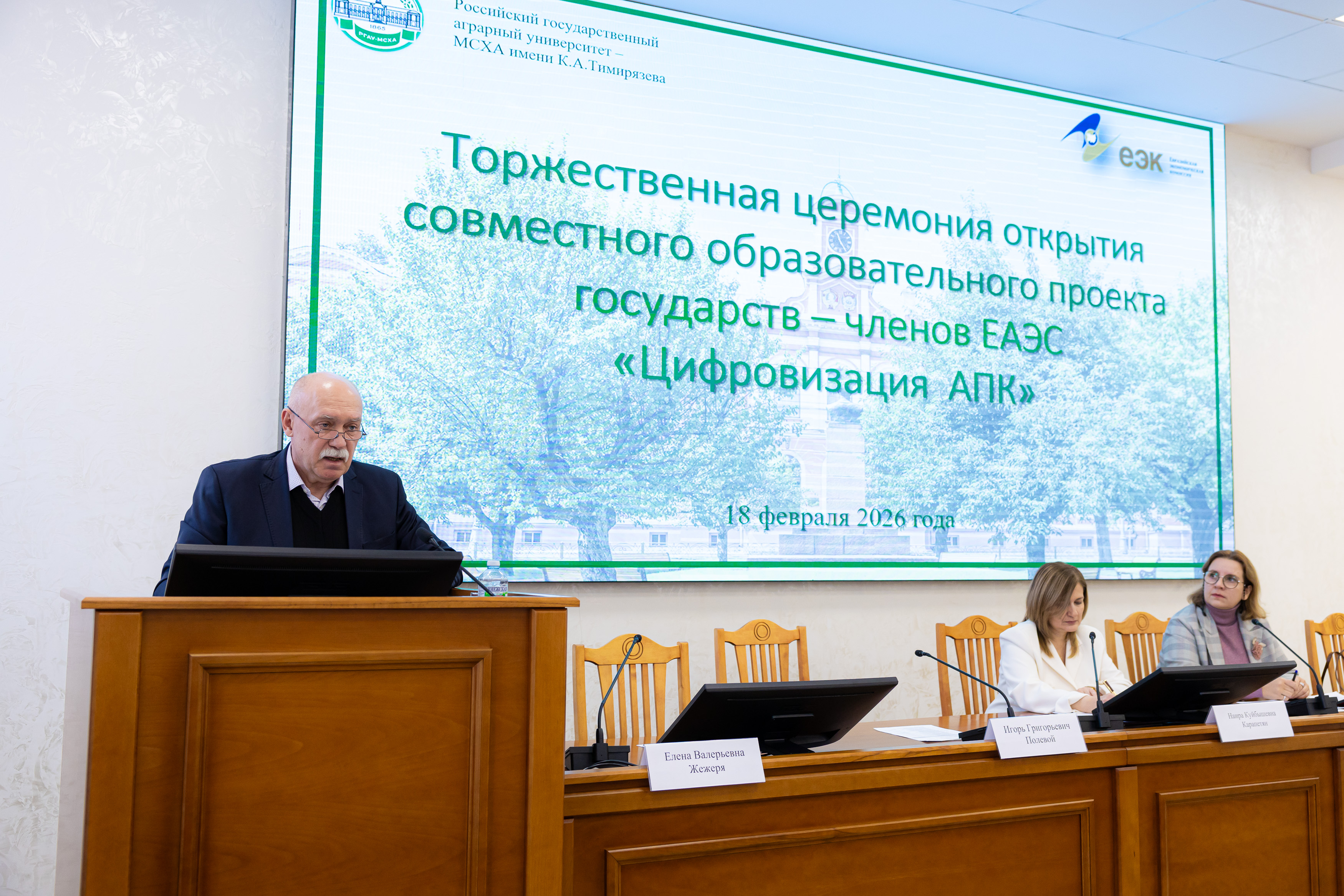 В Российском государственном аграрном университете — МСХА имени К.А. Тимирязева состоялось открытие совместного образовательного проекта государств — членов Евразийского экономического союза «Цифровизация АПК». Мероприятие прошло в формате видеоконференцсвязи, объединив представителей профильных ведомств, аграрных вузов и отраслевых организаций стран ЕАЭС.