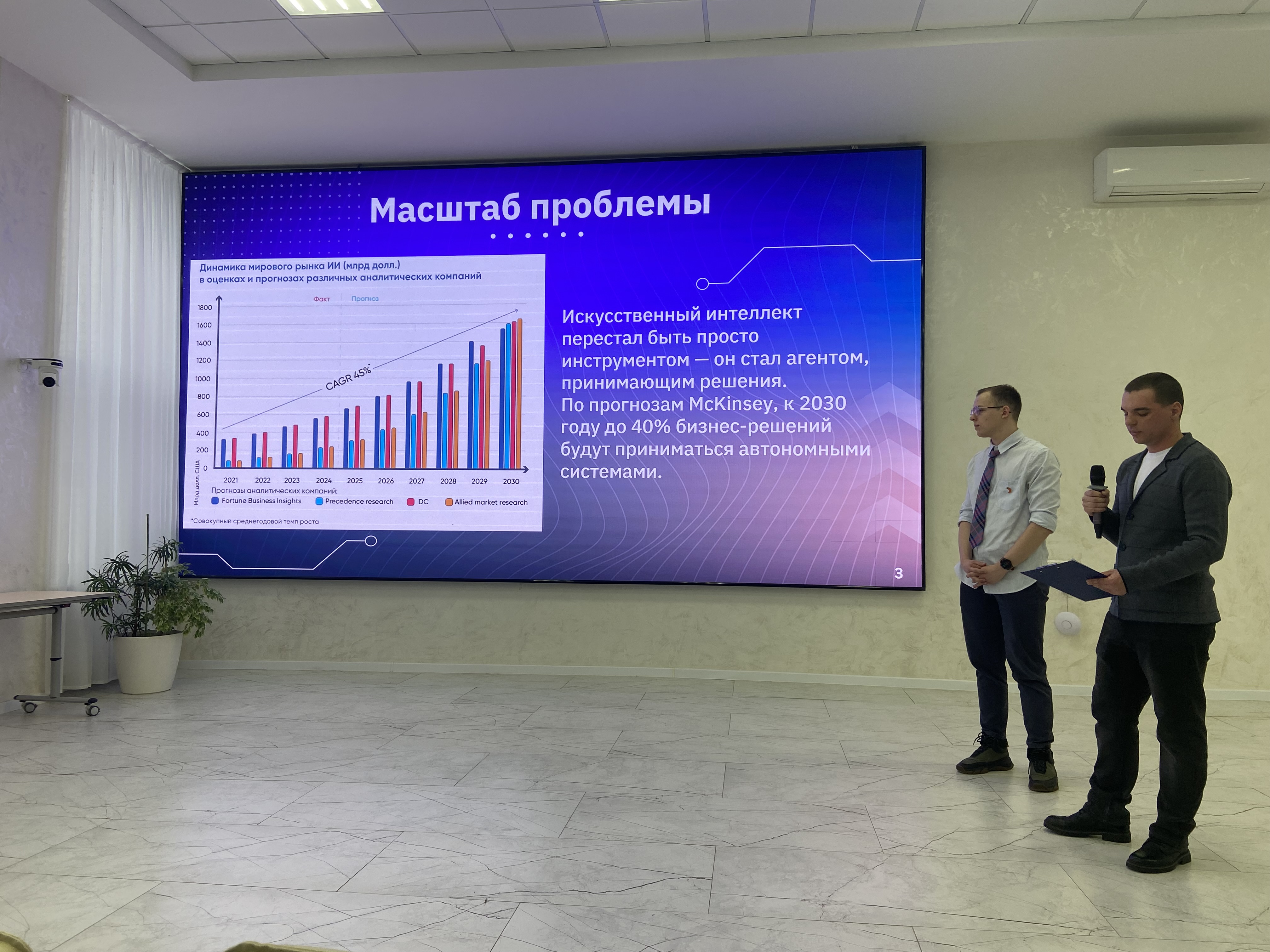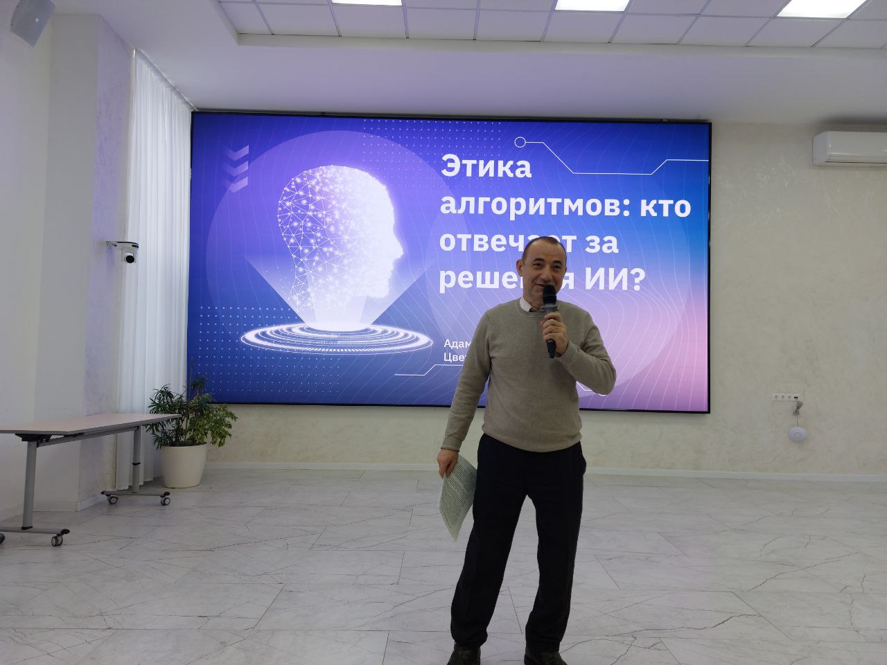 Адамов Александр и Цветков Илья выступили с докладом на тему «Этика алгоритмов: кто отвечает за решения ИИ?». Спикеры подняли вопрос о юридической и моральной ответственности в случаях, когда искусственный интеллект принимает ошибочные или неоднозначные решения.