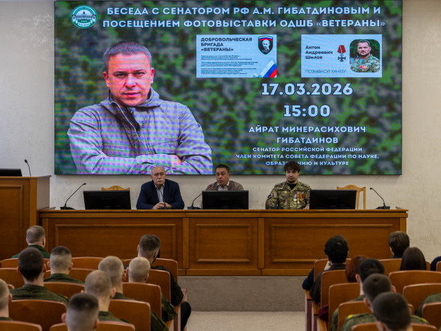 18 Март / 2026День начался с открытия фотовыставки ОДШБ «Ветераны». Честь представить экспозицию выпала почетному гостю университета – сенатору Российской Федерации, члену комитета Совета Федерации по науке, образованию и культуре Айрату Минерасиховичу Гибатдинову. Он также подчеркнул важность сохранения памяти о героях и их подвигах. О своих боевых товарищах, запечатленных на фотографиях, проникновенно рассказал боец подразделения «Ветеран» Николай Владимирович Кашаев, который ответил на многочисленные вопросы посетителей выставки, поделившись личным военным опытом и взглядами на текущую ситуацию.