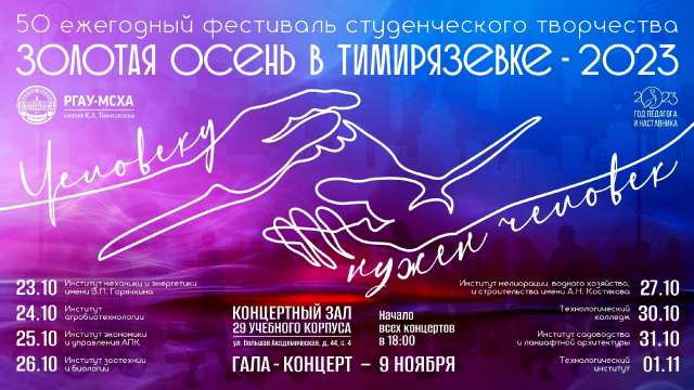 Завершит традиционный фестиваль студенческого творчества гала-концерт. В него будут включены самые лучшие номера, представленные новым поколением тимирязевцев. Заключительный вечер состоится 9 ноября.