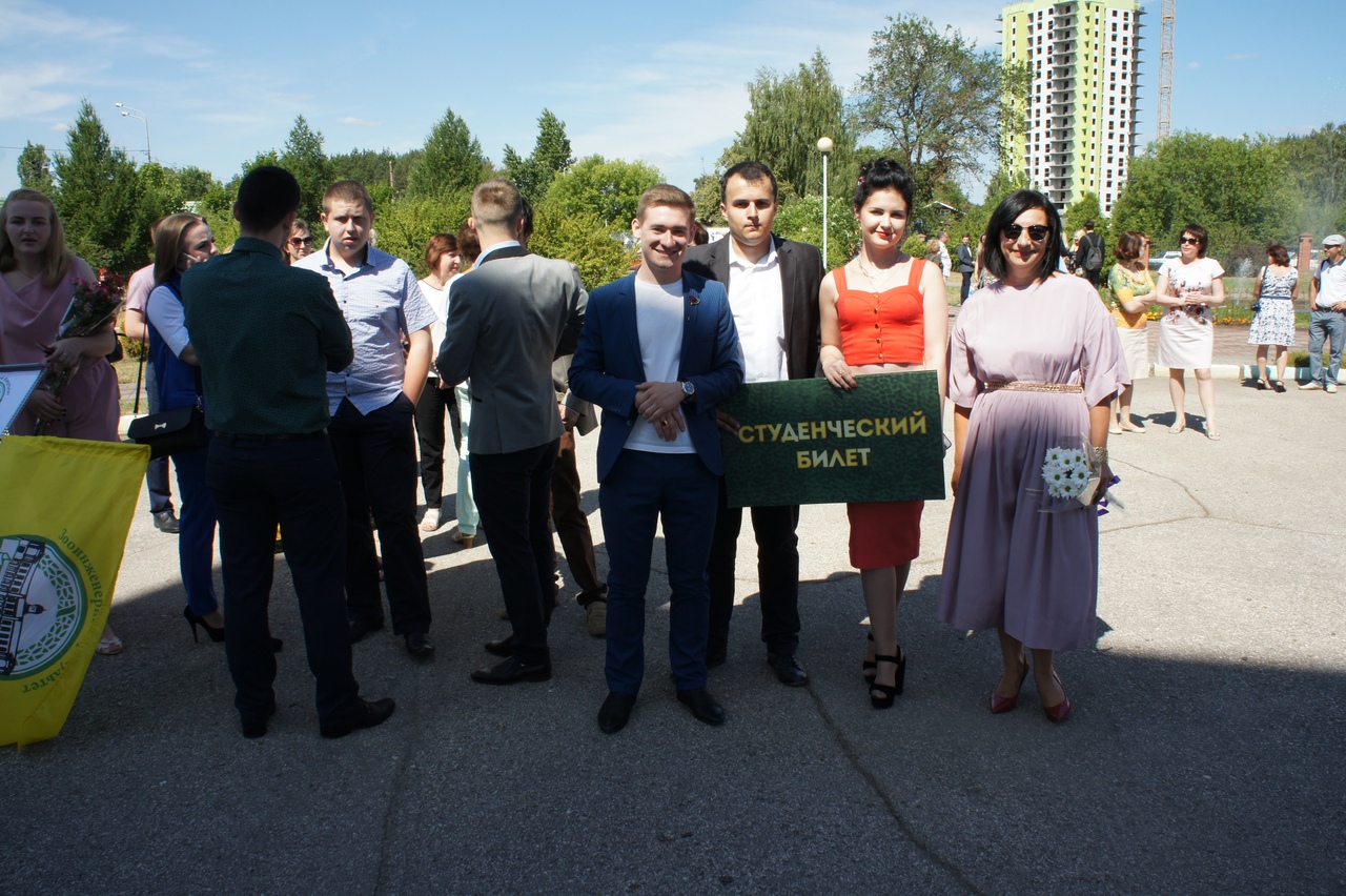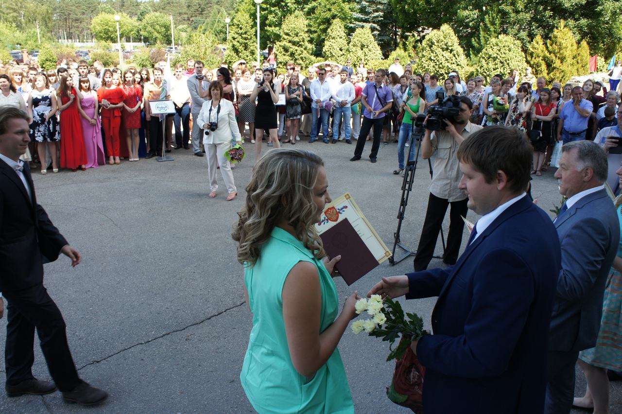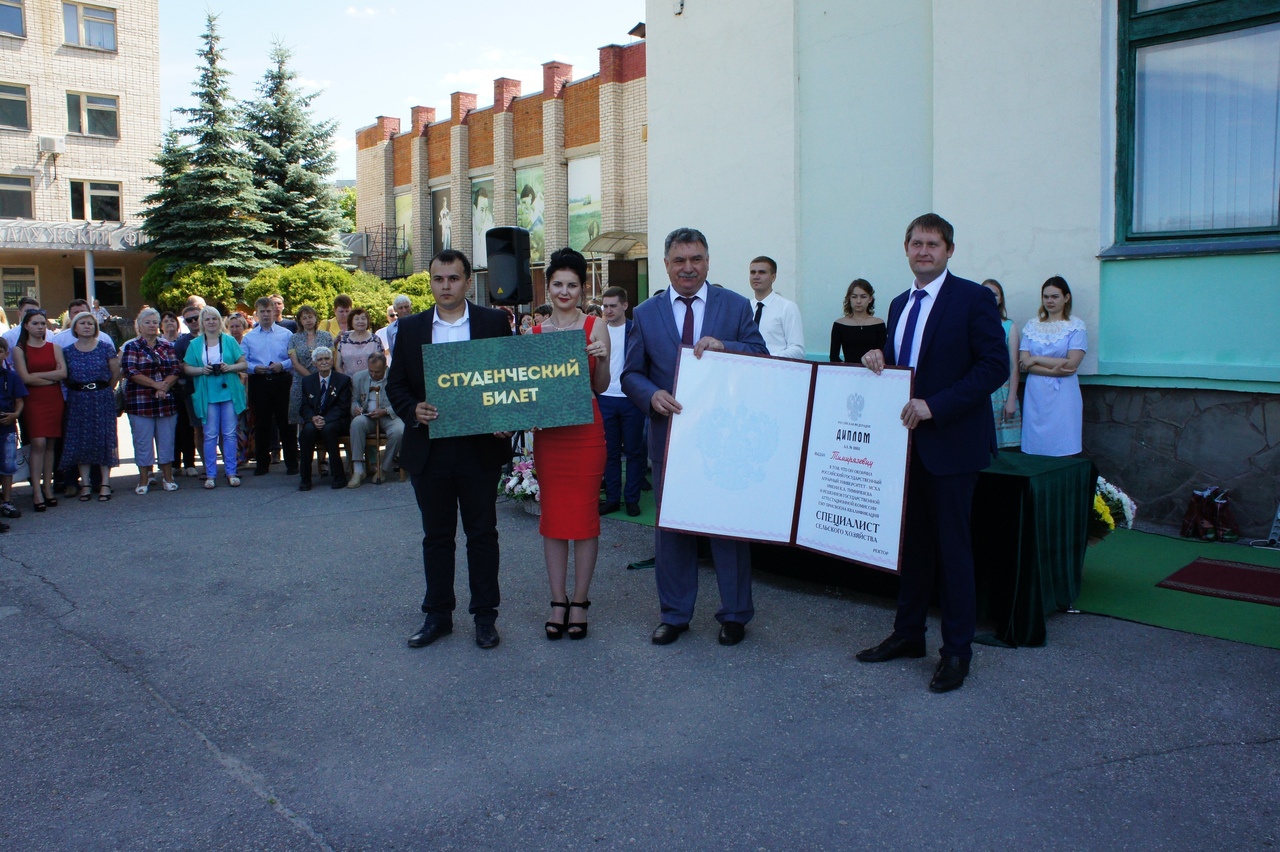 По традиции состоялось торжественное вручение символического диплома. Выпускники зооинженерного факультета Екатерина Астахова и Алыш Тагиев попрощались со студенческим билетом и получили из рук проректора по учебно-методической работе университета Сергея Золотарева и и.о. директора Калужского филиала Алексея Слипца диплом.