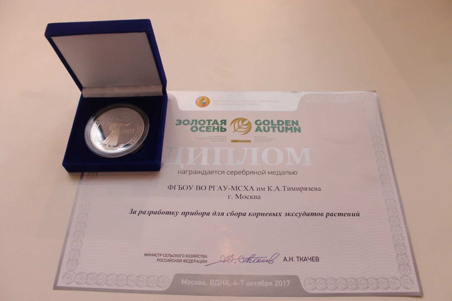 На Всероссийской агропромышленной выставке «Золотая осень 2017», прошедшей на ВДНХ, были подведены итоги конкурсов, объявленных Минсельхозом России. Научные достижения тимирязевцев были отмечены 9 золотыми, 5 серебряными и 3 бронзовыми медалями.