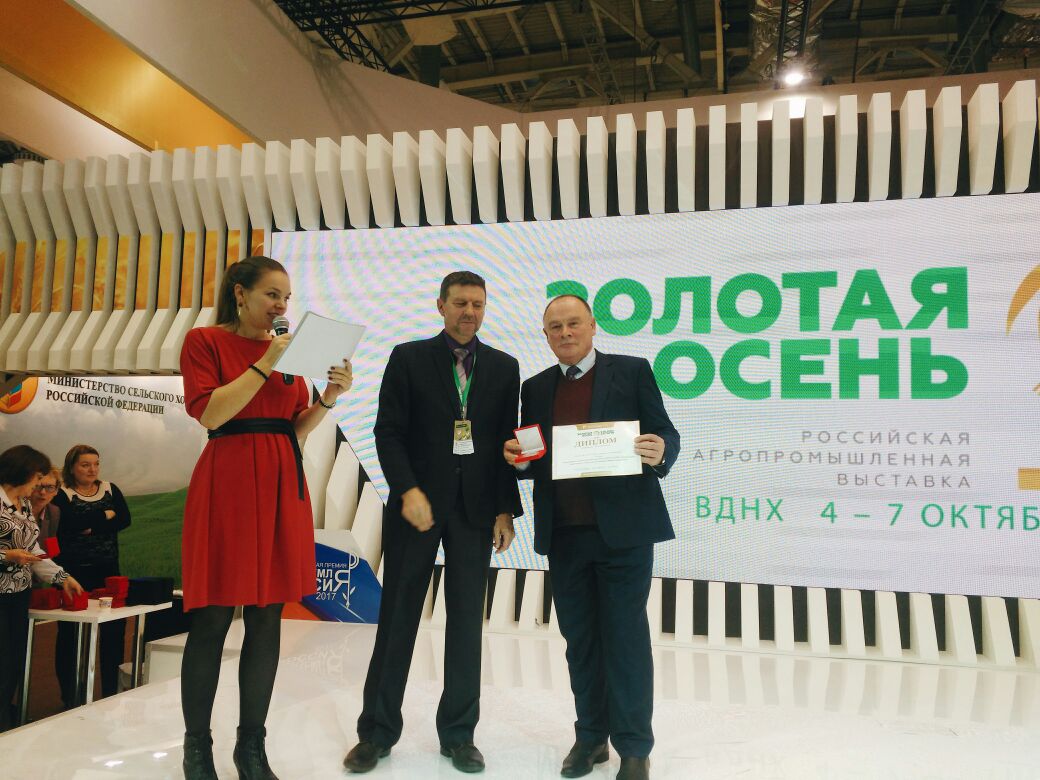в номинации «Молочная продукция» работа «За разработку и внедрение в технологию производства высококачественного молока и подготовку кадров АПК» (Х.А. Амерханов, О.И. Соловьева, Г.В. Родионов, А.Ю. Воронина, П.П. Резеньков, А.А. Ганеев) награждена дипломом и золотой медалью;