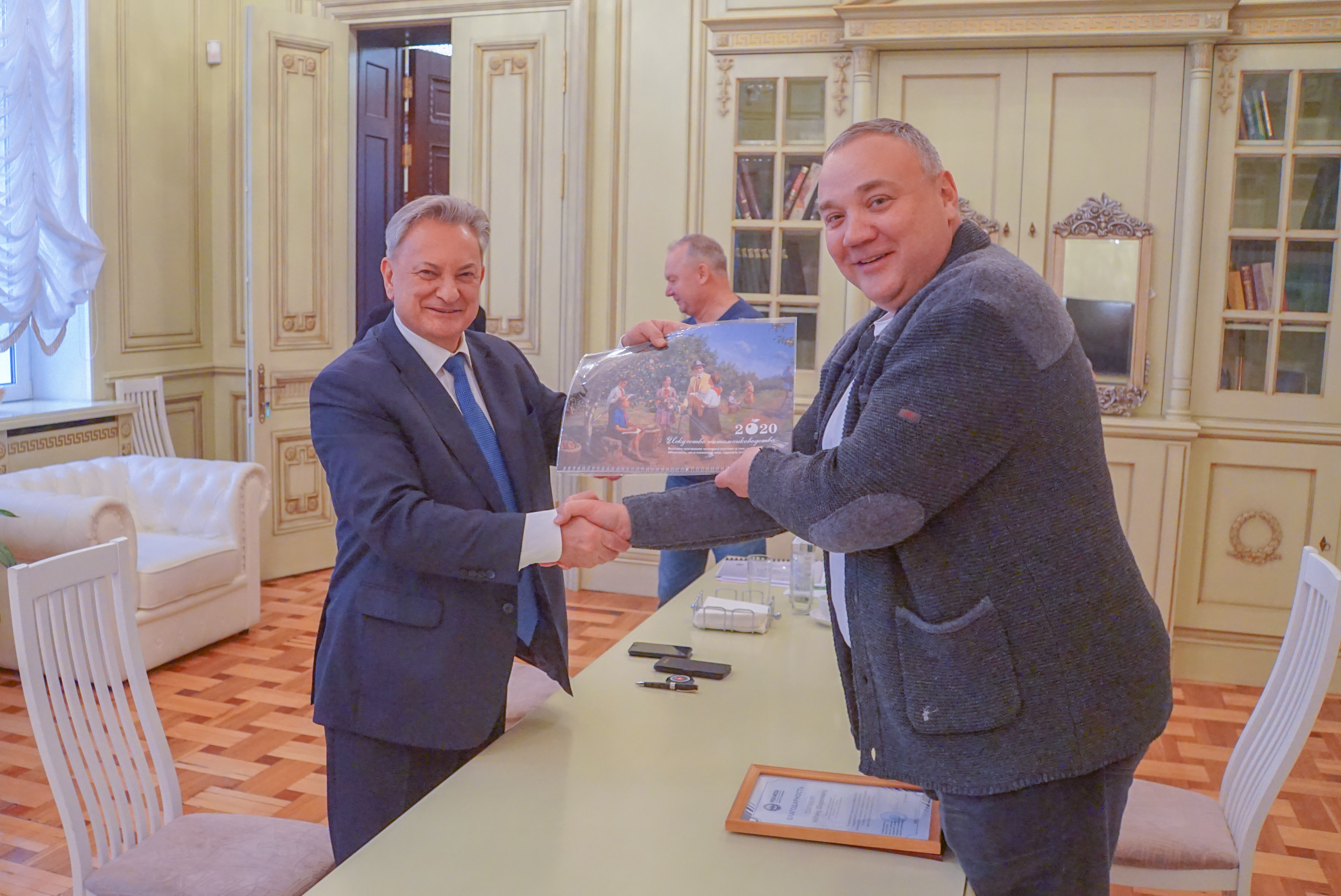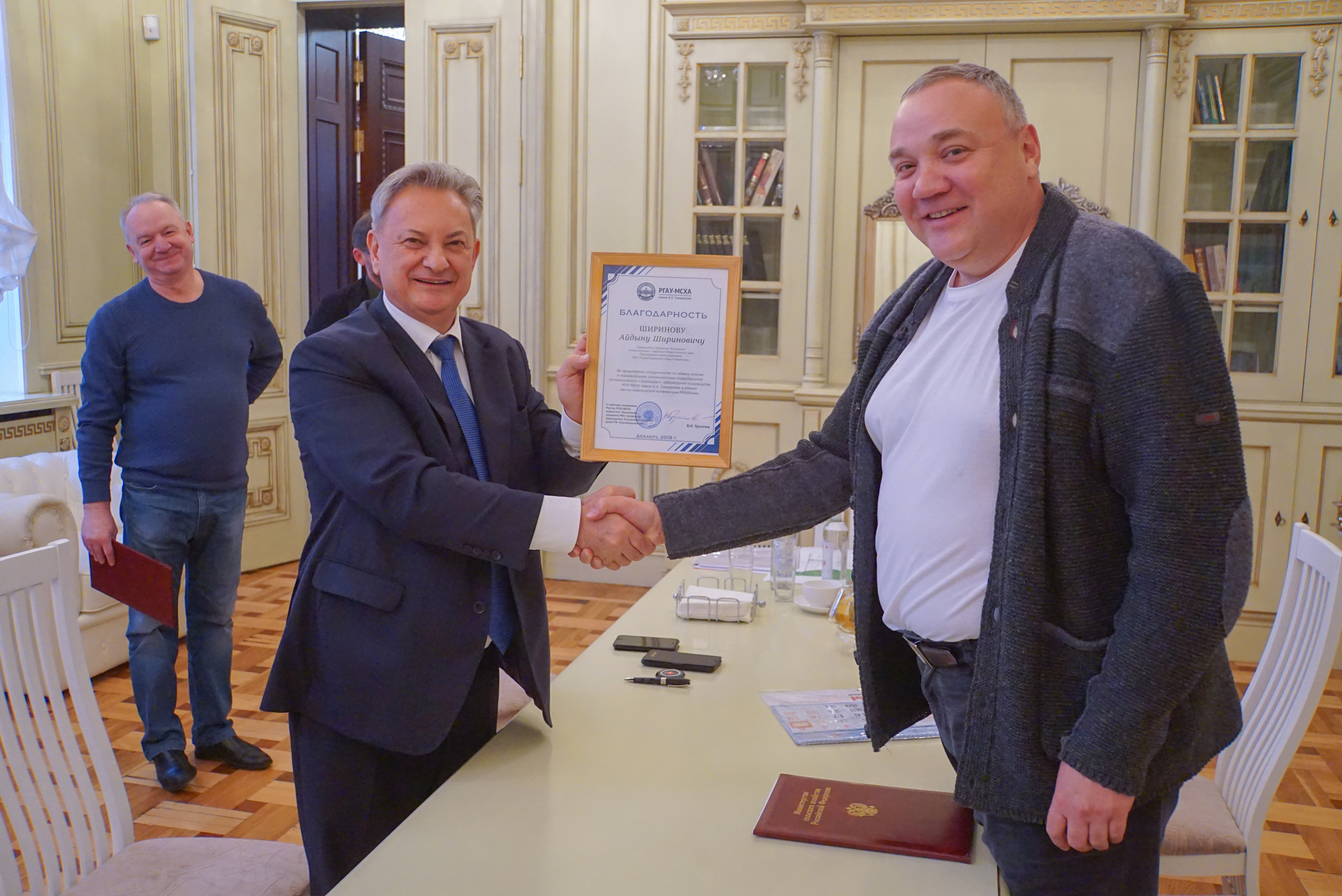 В завершение встречи В.И. Трухачев поблагодарил А.Ш. Ширинова за приглашение тимирязевцев к участию в международной, специализированной выставке-конференции «PRO Яблоко 2019», состоявшейся в Минеральных Водах в ноябре т.г., и активное взаимодействие на этой форумной площадке. Была высказана уверенность, что подписанное Соглашение о сотрудничестве принесет обеим сторонам значительную пользу.