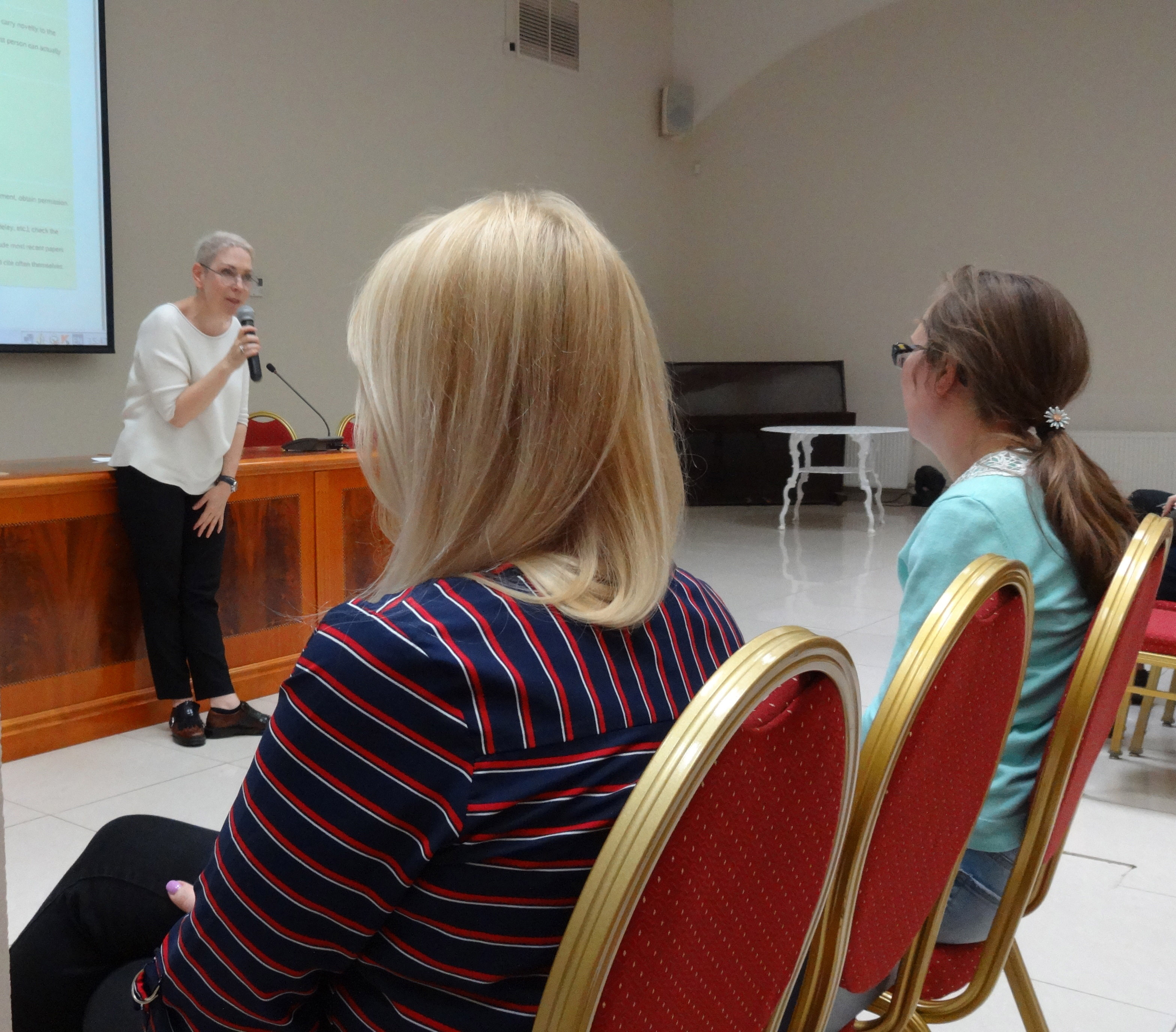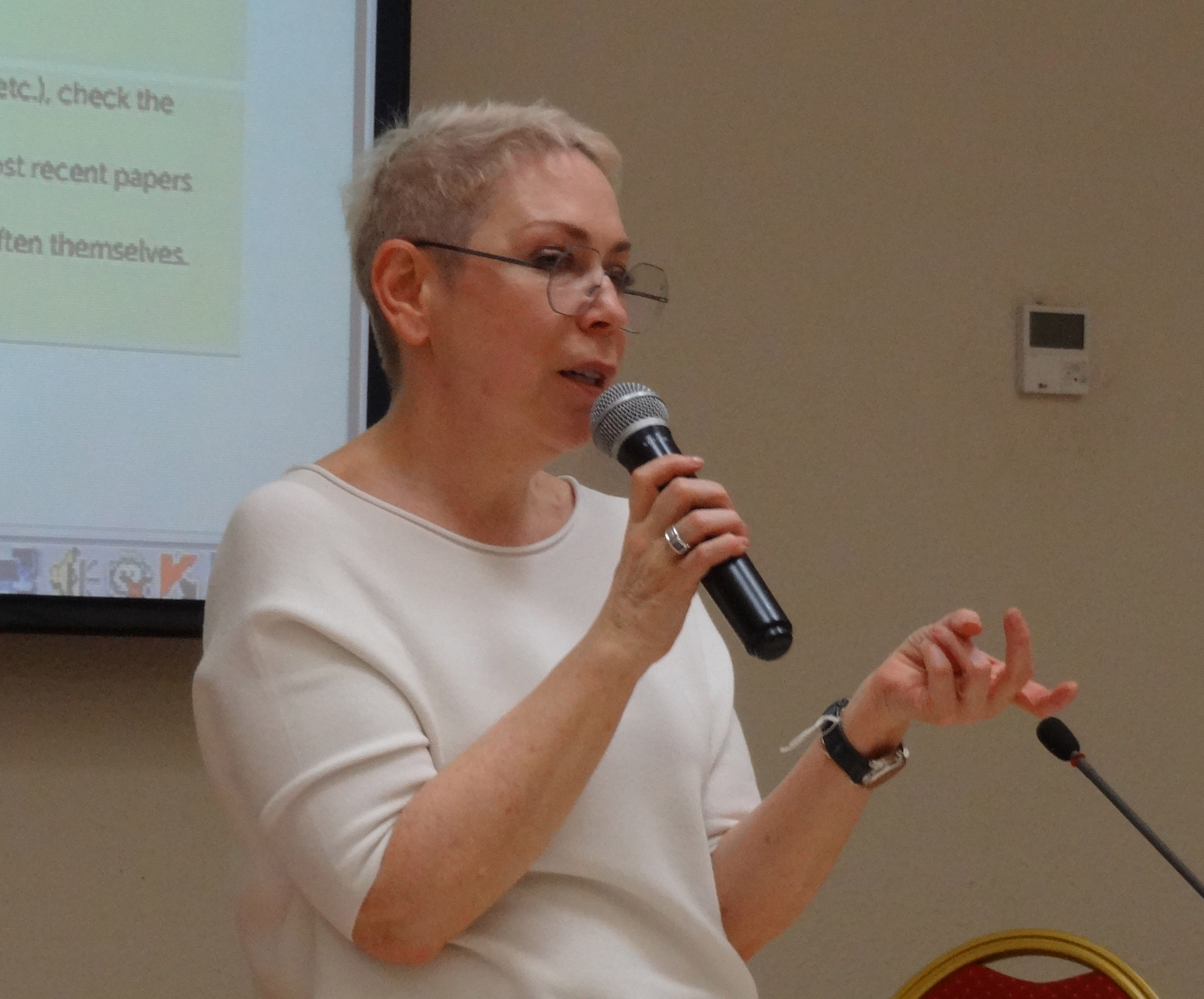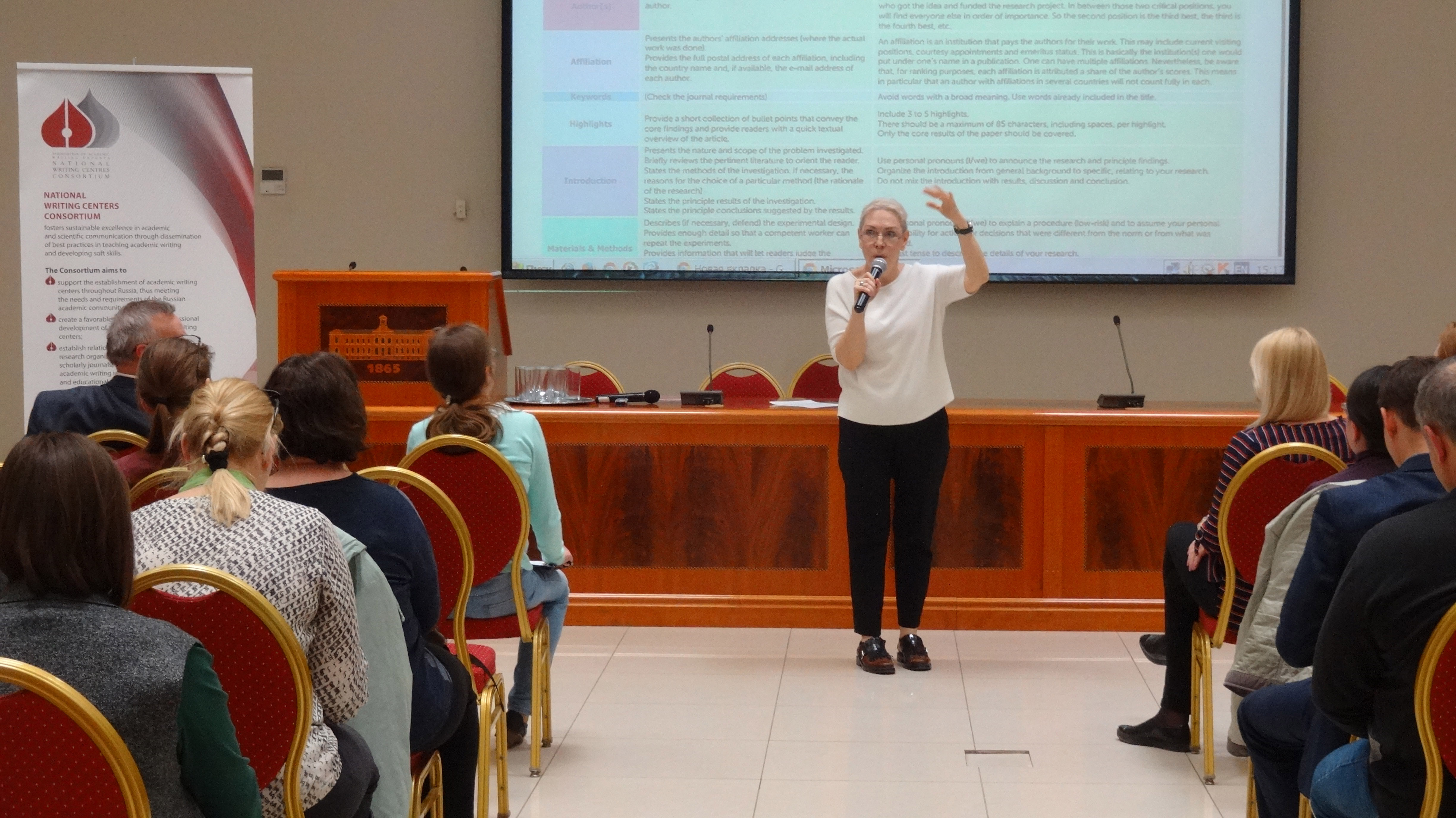 Елена Базанова, кандидат педагогических наук и эксперт по английскому языку РАН, директор Офиса академического письма «МИСиС», директор Центра языковой подготовки и тестирования МФТИ,рассказала аудитории о том, как правильно составить заголовок, аннотацию и выводы в английском тексте дляпубликации в научном журнале. Самоцитирование в научных статьях не исключается, однако в разумных пределах: не более 10 процентов. Много других тонкостей открыла слушателям Елена Михайловна.