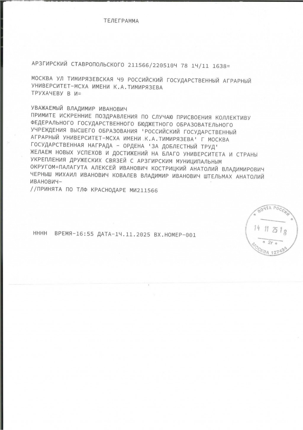 Поздравление с Орденом «За доблестный труд» от Арзгирского района Ставропольского края.