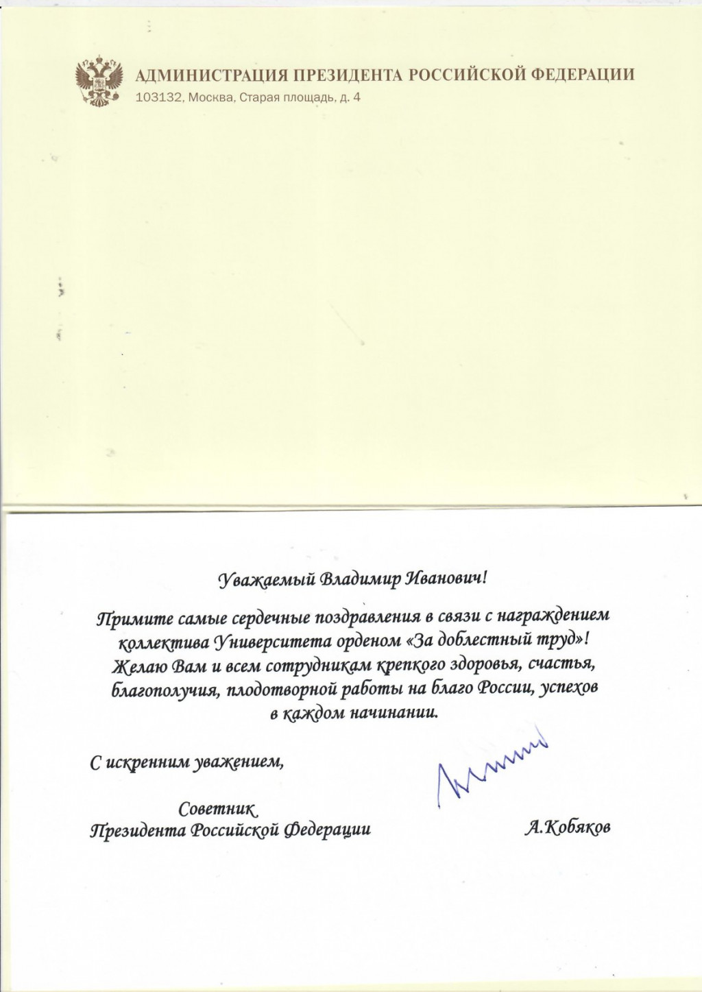 Поздравление с Орденом «За доблестный труд» от советника президента Российской Федерации Антона Анатольевич Кобякова.