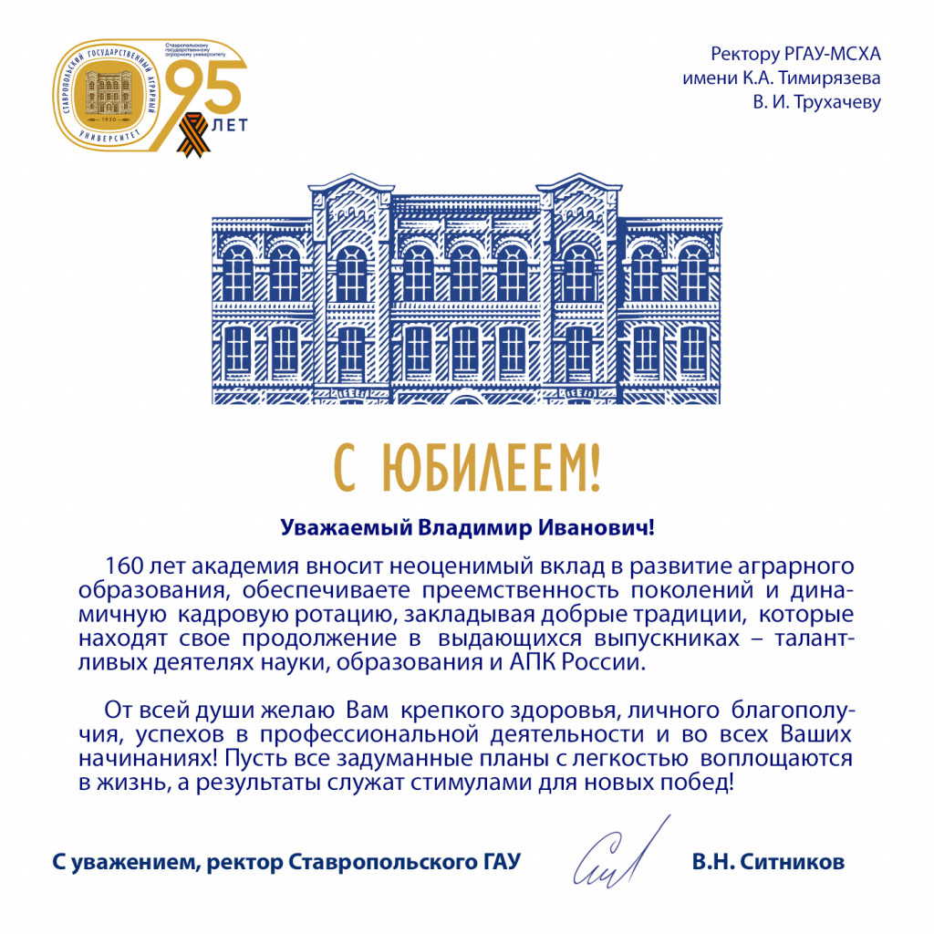 Поздравление со 160-летием Тимирязевской академии от Ставропольского государственного аграрного университета