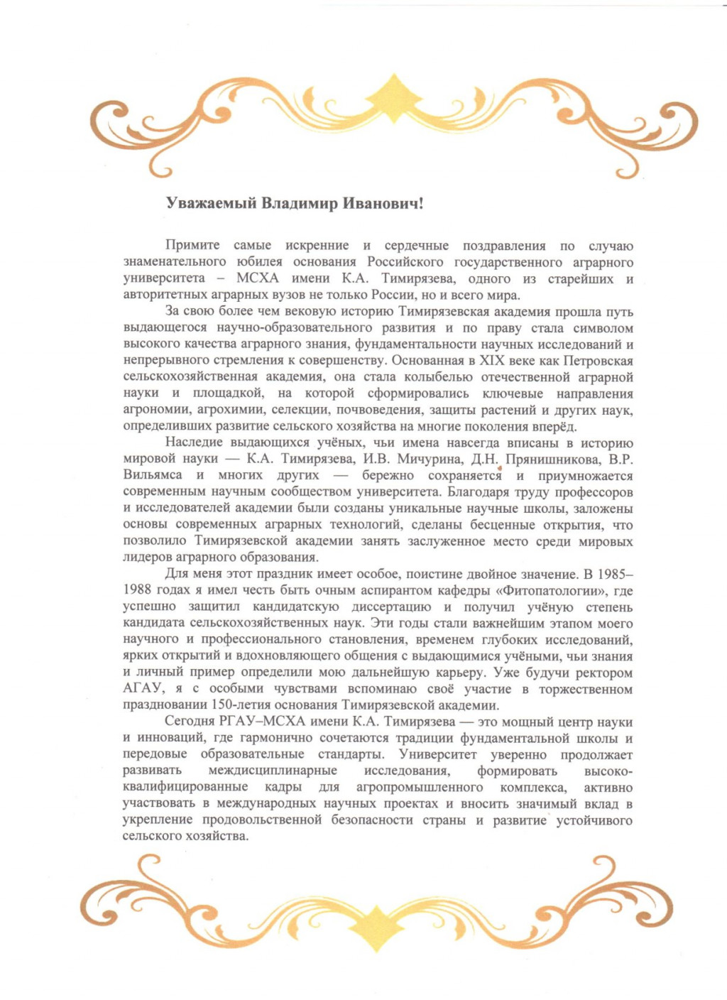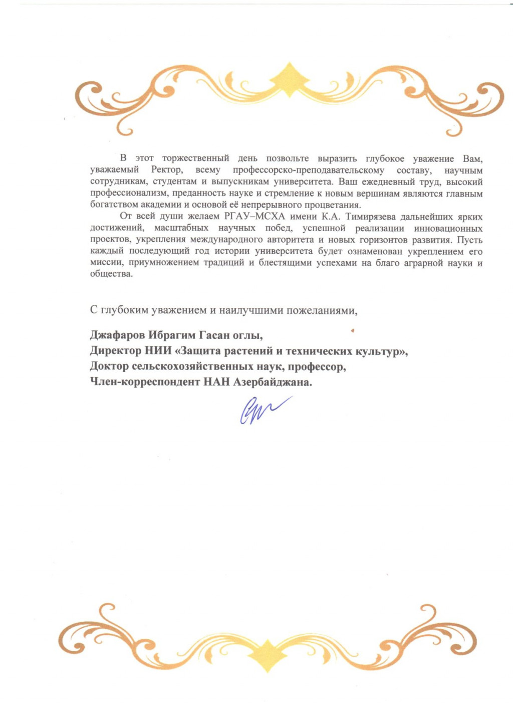 Поздравление со 160-летием Тимирязевской академии от академика НАНИ, члена Совета ректоров ведущих аграрных вузов государств-участников СНГ Ибрагима Гасан оглы Джафарова.