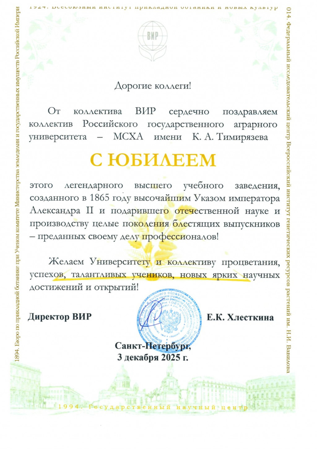 Поздравление со 160-летием Тимирязевской академии от Всероссийского института растениеводства имени Н. И. Вавилова.