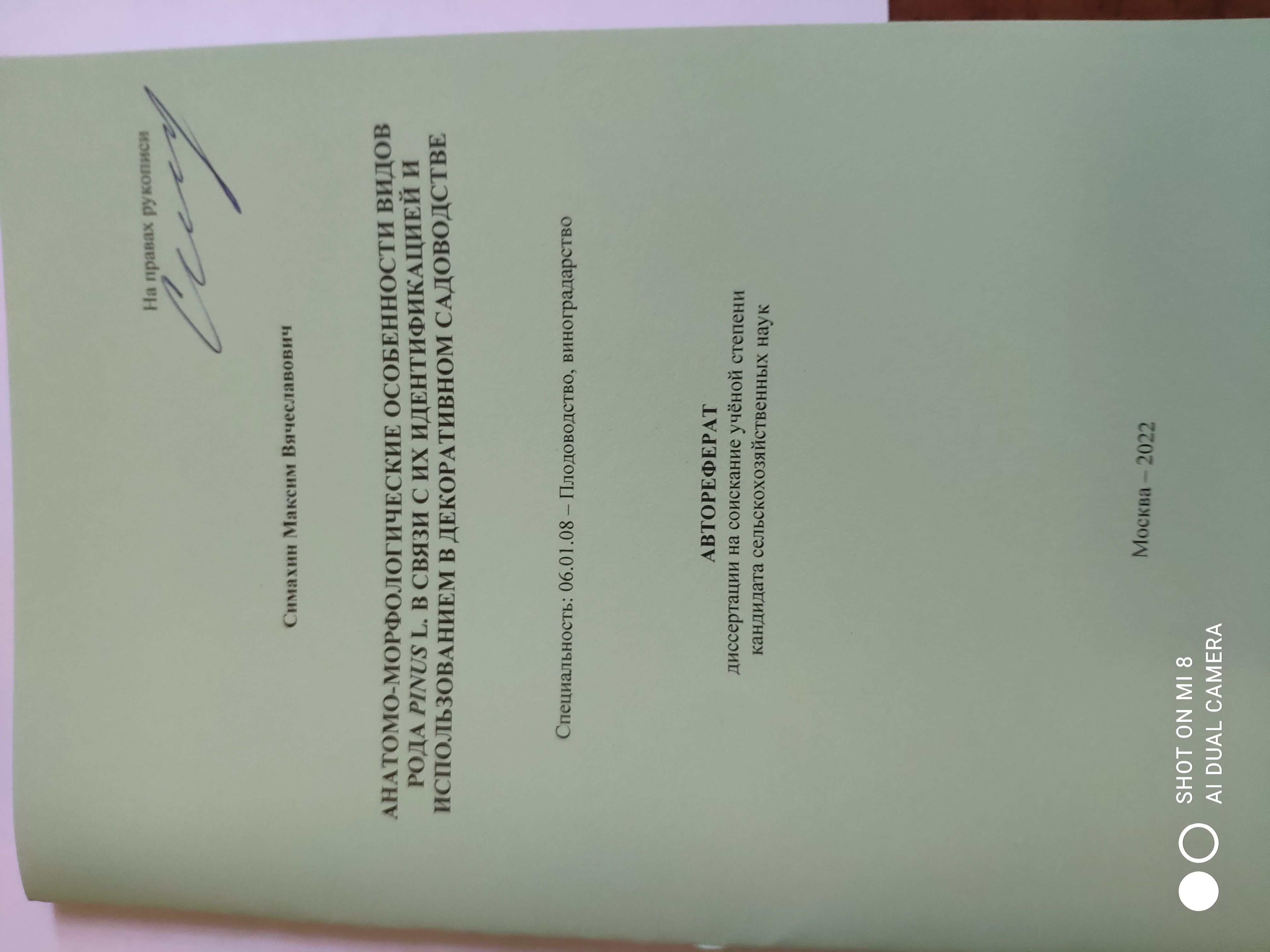 27 апреля 2022 года состоялась защита диссертации на соискание ученой степени кандидата сельскохозяйственных наук по специальности: 06.01.08 – Плодоводство, виноградарство на тему «Анатомо-морфологические особенности видов рода Pinus L. в связи с их идентификацией и использованием в декоративном садоводстве» ассистента кафедры декоративного садоводства и газоноведения, заместителя директора института Садоводства и ландшафтной архитектуры по воспитательной работе Симахина Максима Вячеславовича (научный руководитель к.б.н., доцент Тазина С.В.).