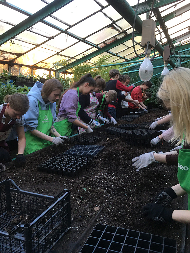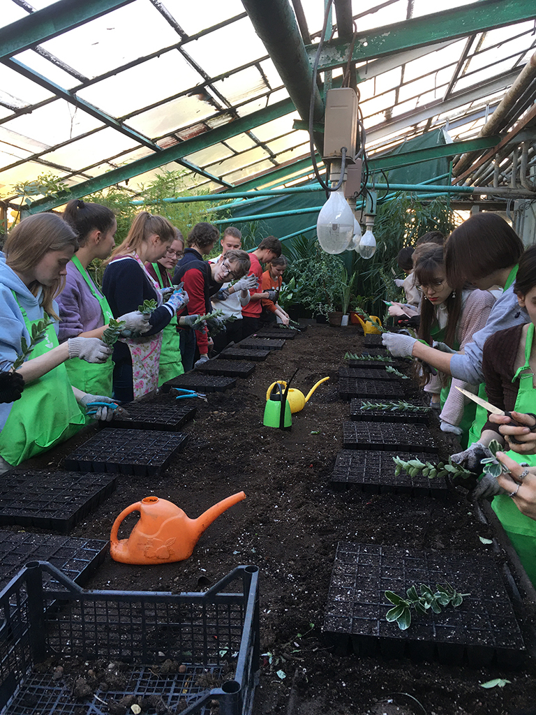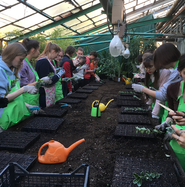 В теплице, где выращивают и содержат большой ассортимент комнатных растений, студенты смогли познакомиться с азами вегетативного размножения на примере декоративной культуры – бересклет. Студенты попробовали сами набивать кассеты торфом, черенковать растения, а затем ставить черенки на укоренение. Также многие ребята высказали желание приходить и помогать в уходе за растениями в качестве волонтеров.