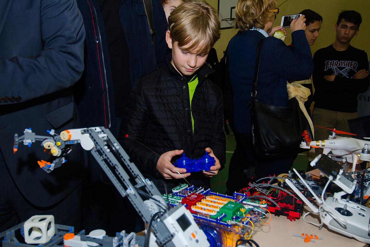 — Ой, что это за штучка, — показывала на пульт управления машинами-роботами симпатичная старшеклассница.