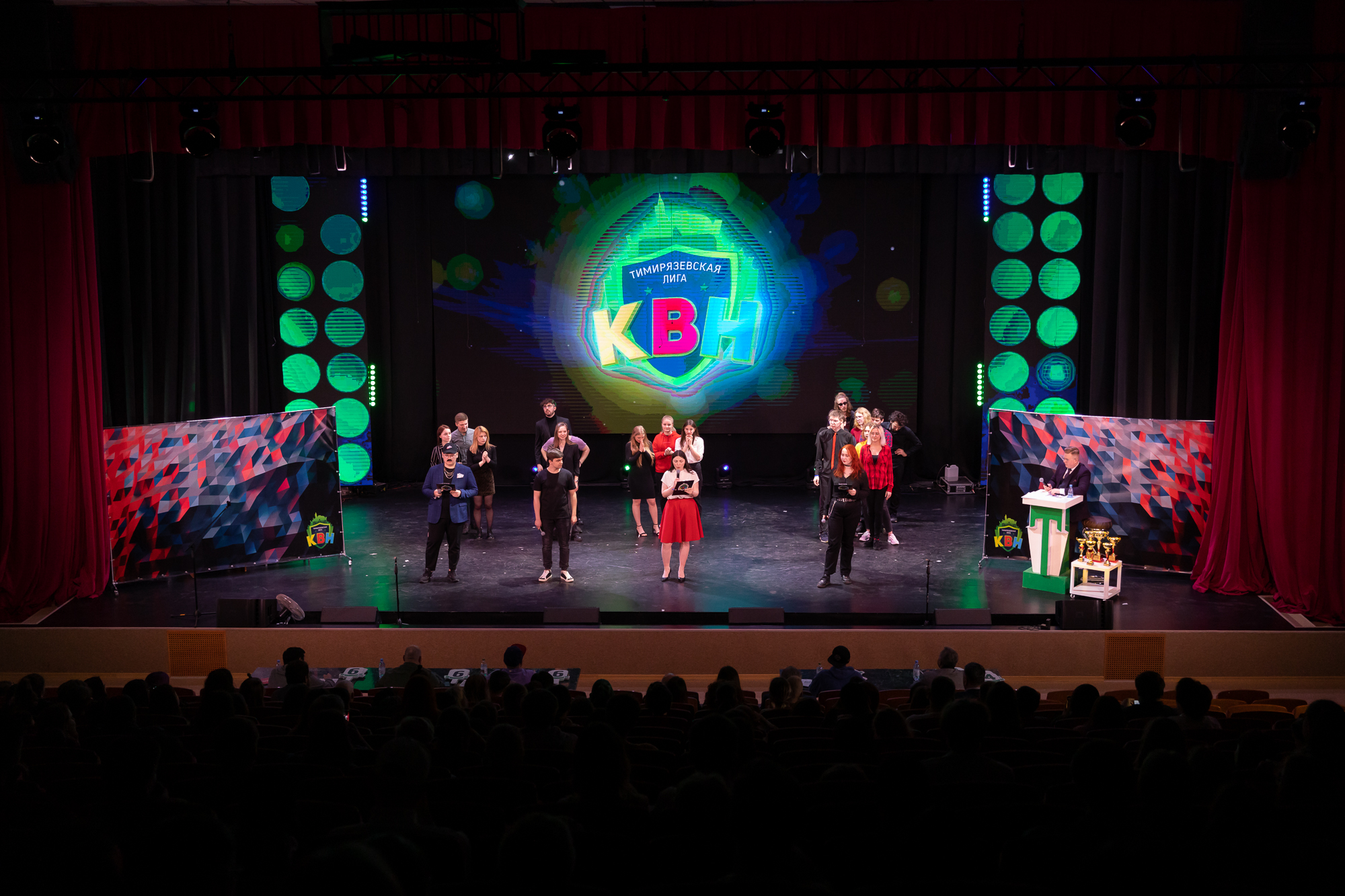В обновлённом актовом зале учебного корпуса № 29 прошла финальная игра сезона Тимирязевской лиги Клуба веселых и находчивых, а также впервые состоялся Кубок дебютантов РГАУ-МСХА. Всех причастных к большому студенческому фестивалю юмора поздравил ректор университета, Академик РАН, профессор Владимир Иванович Трухачев.