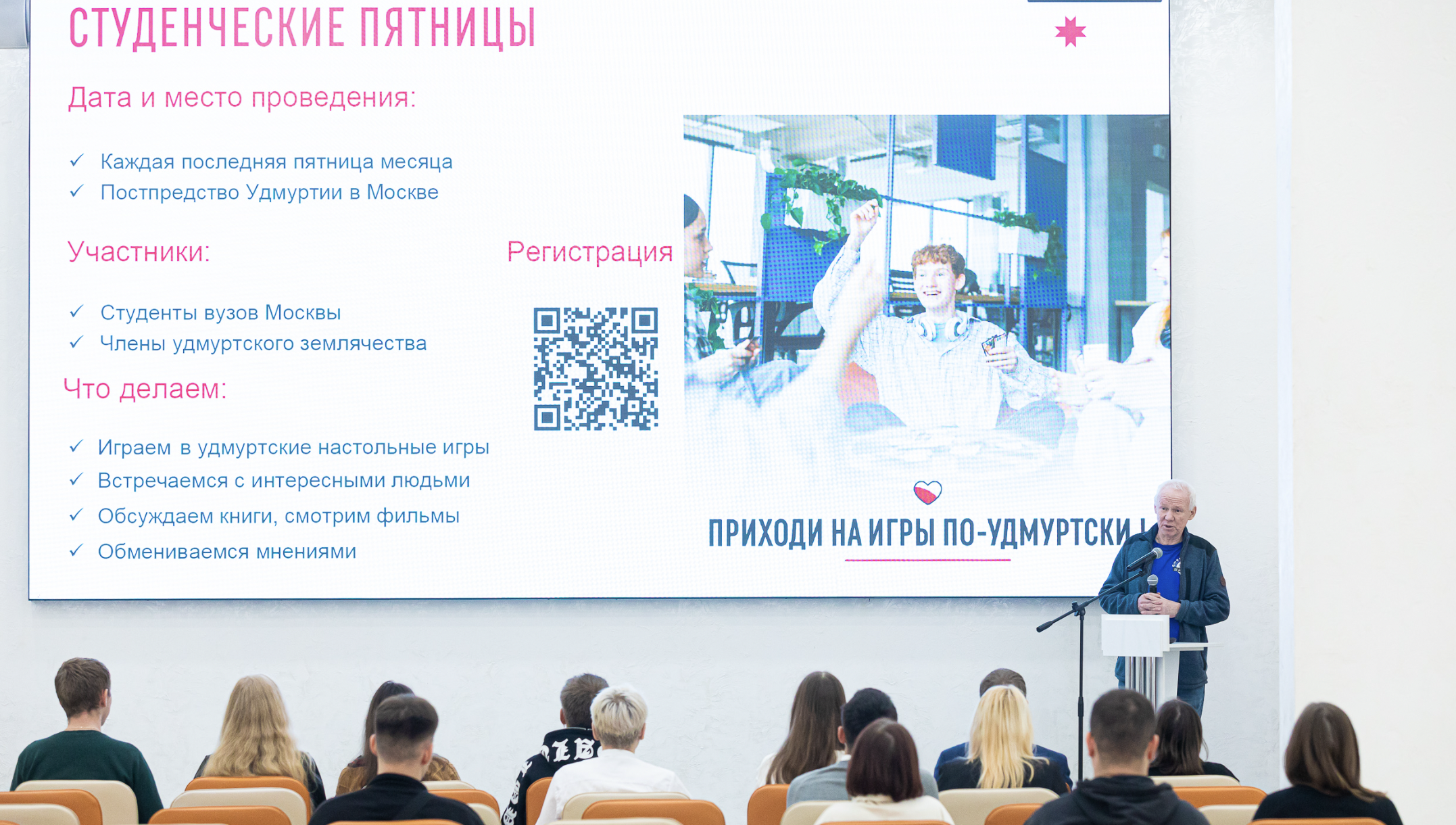 Заместитель руководителя аппарата Постоянного представительства Главы Удмурткой Республики в Москве Виктория Плюсова рассказала студентам о мероприятиях в постпредстве. К примеру, студенческие пятницы, серия мероприятий #УдмуртиявКонтакте и другие.
