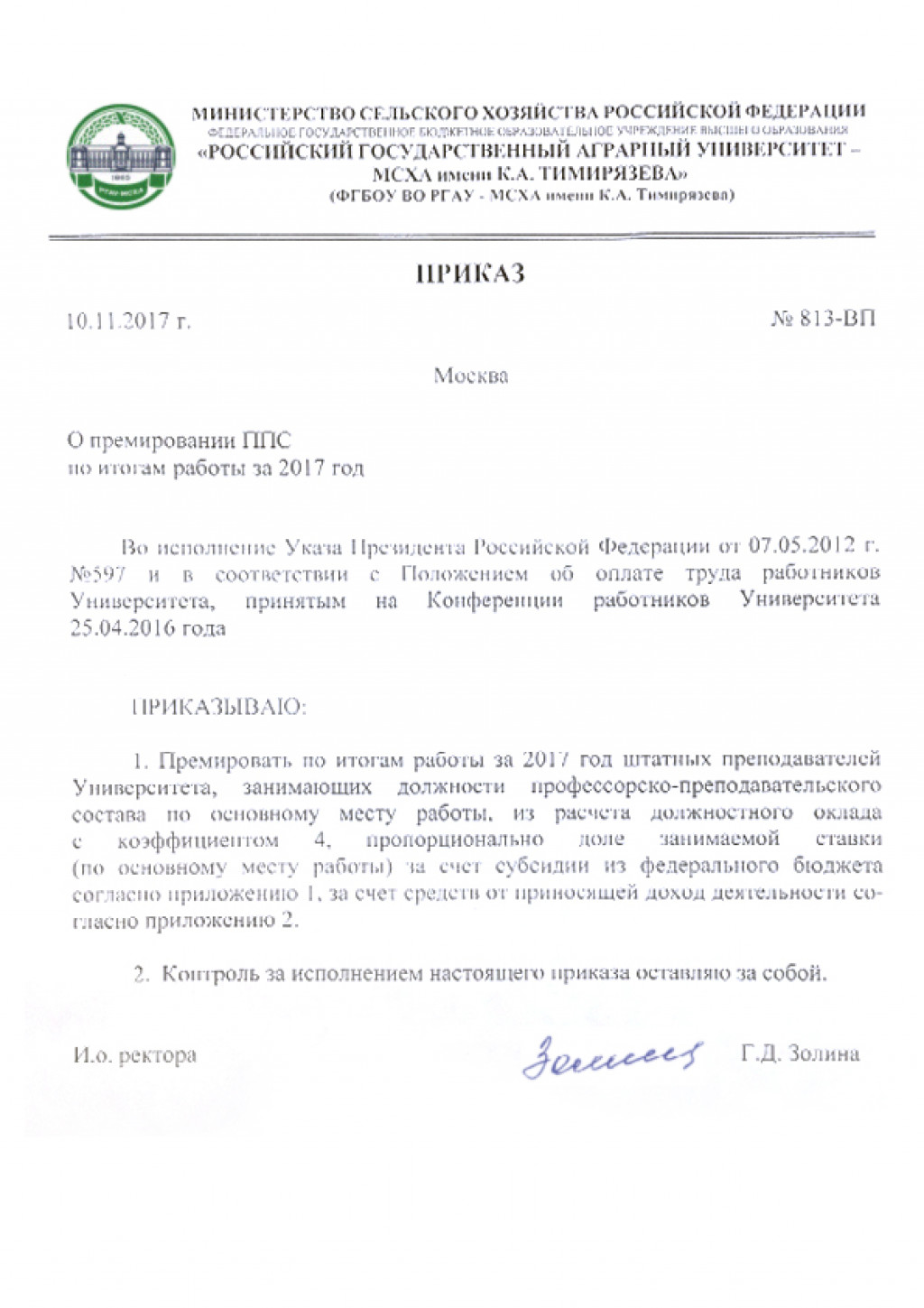 Соответствующий приказ подписан и.о. ректора Тимирязевской академии Галиной Золиной.
