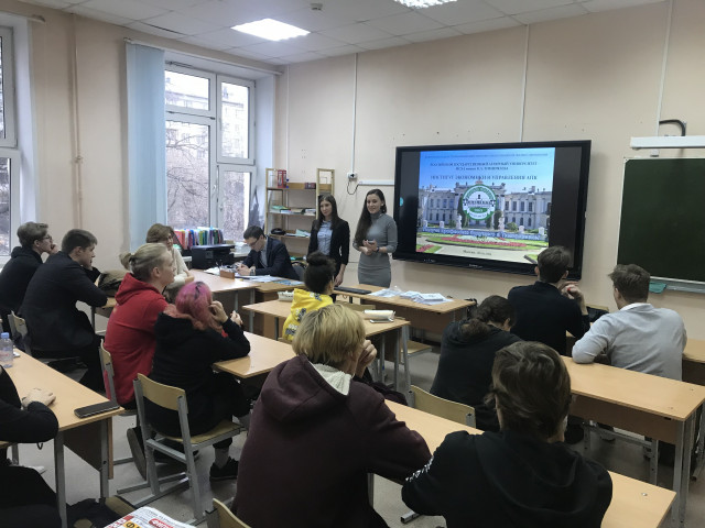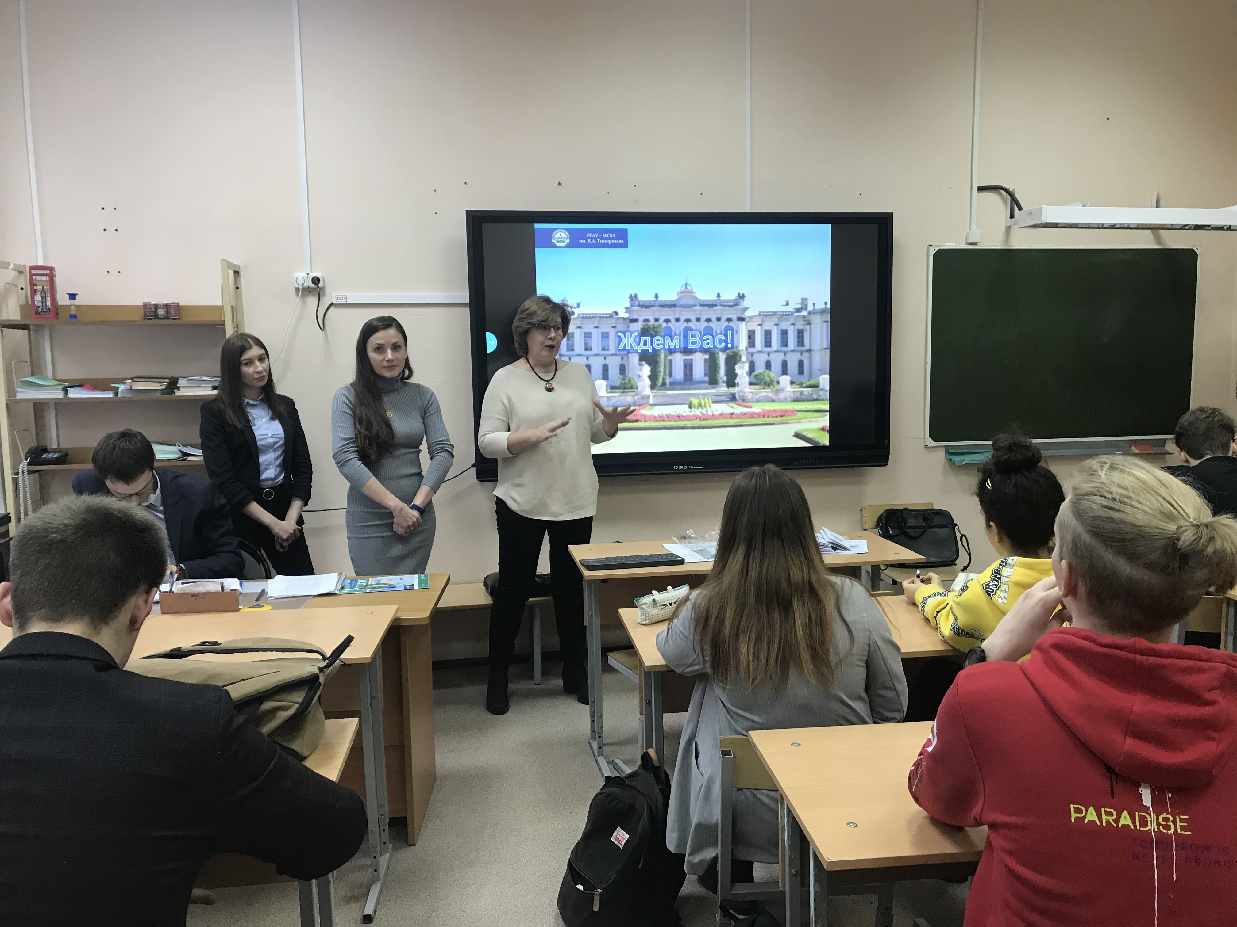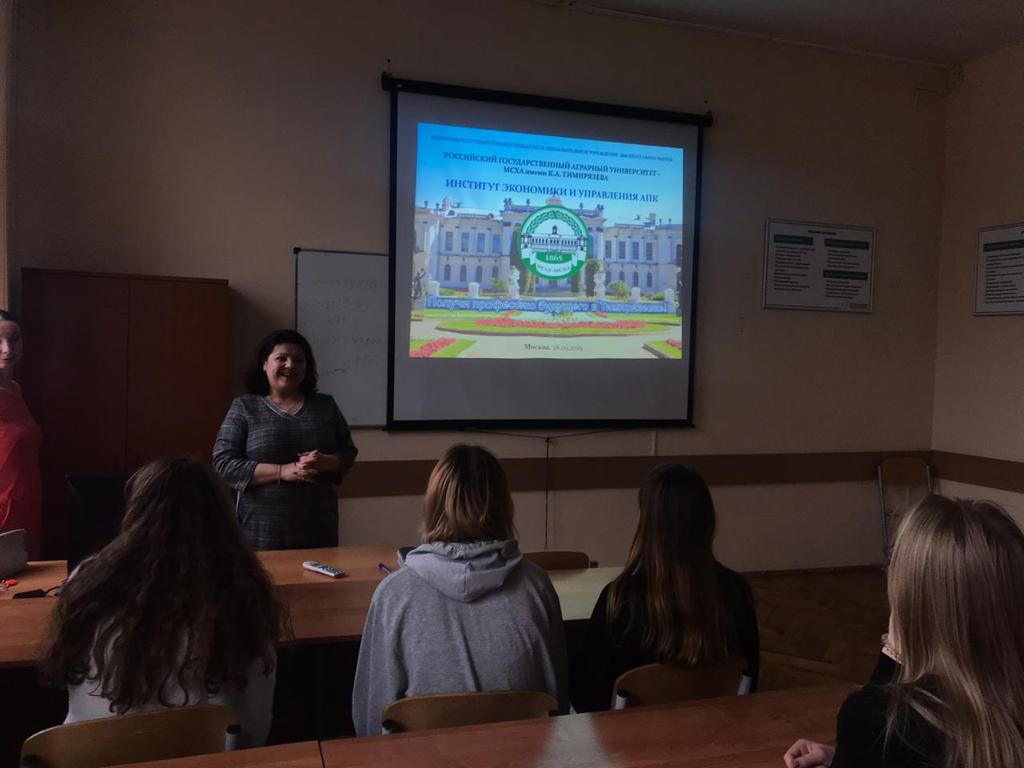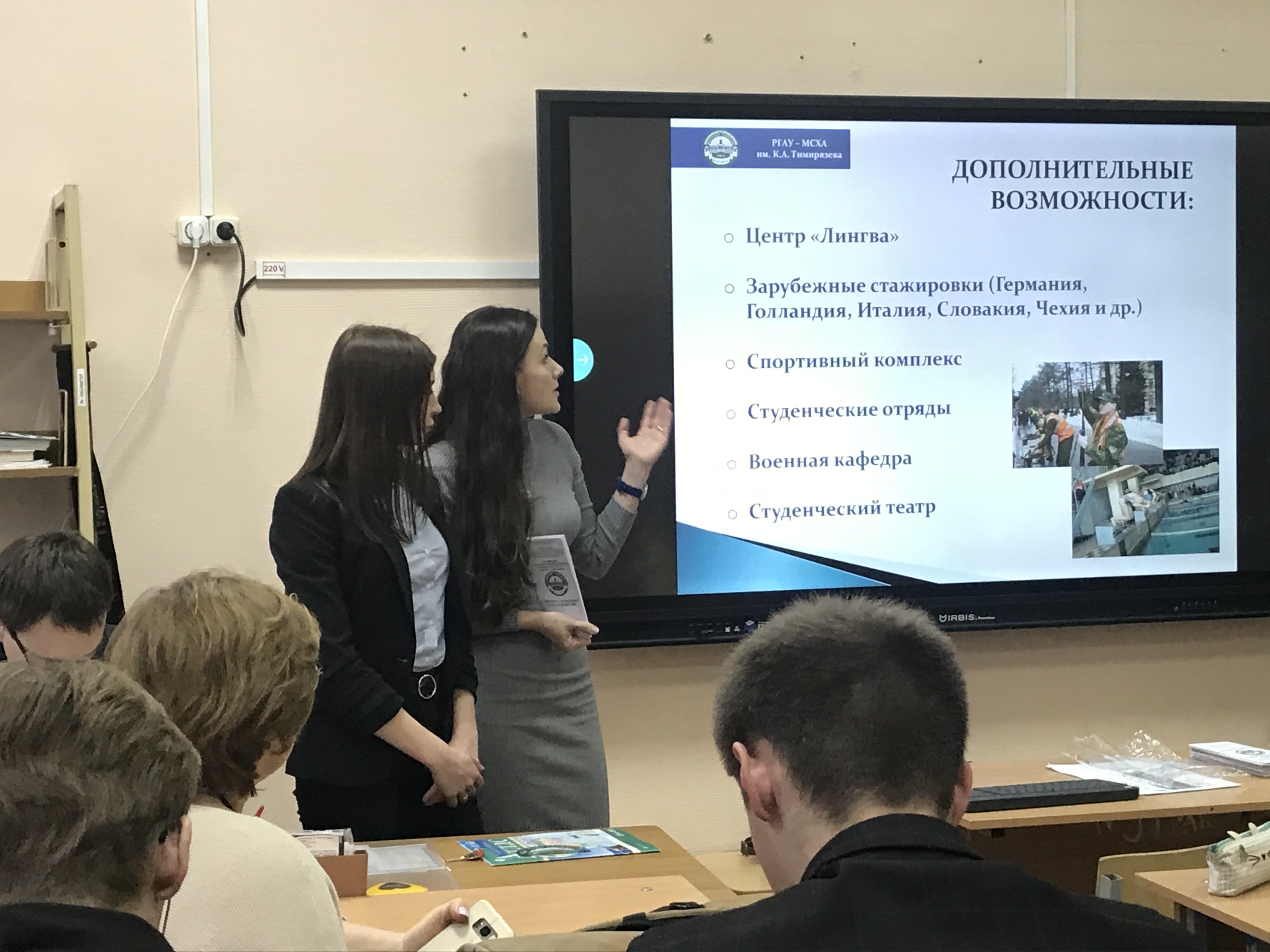 Учащиеся были ознакомлены с историей, выдающимися учеными, структурой РГАУ-МСХА имени К.А. Тимирязева, Института экономики и управления АПК, осуществляемыми направлениями подготовки, формами обучения, условиями приема абитуриентов, планируемых днях открытых дверей и программой весенней школы для учащихся, разработанной на базе ИЭиУАПК.