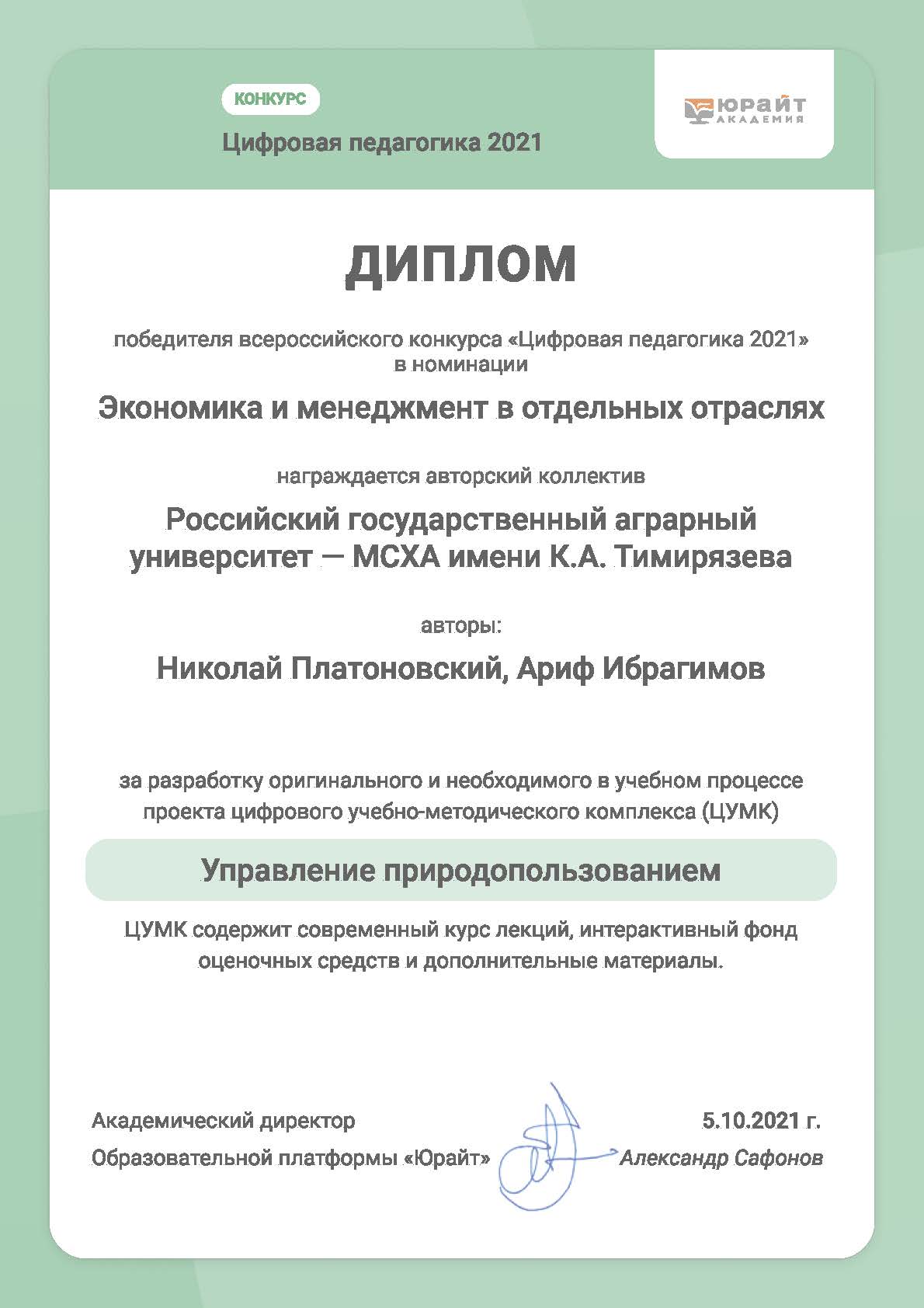 Цифровой учебно-методический комплекс (учебный курс) «УПРАВЛЕНИЕ ПРИРОДОПОЛЬЗОВАНИЕМ», подготовленный учеными Тимирязевки получил диплом победителя всероссийского конкурса «Цифровая педагогика 2021» в номинации «Экономика и менеджмент в отдельных отраслях».