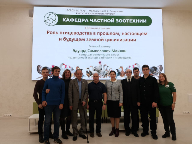 Кафедра частной зоотехнии выступила организатором публичной лекции по птицеводству «Роль птицеводства в прошлом, настоящем и будущем земной цивилизации». В мероприятии приняло участие около 250 студентов Института зоотехнии и биологии, а главным спикером был независимый эксперт в области птицеводства Эдуард Самвелович Маилян.