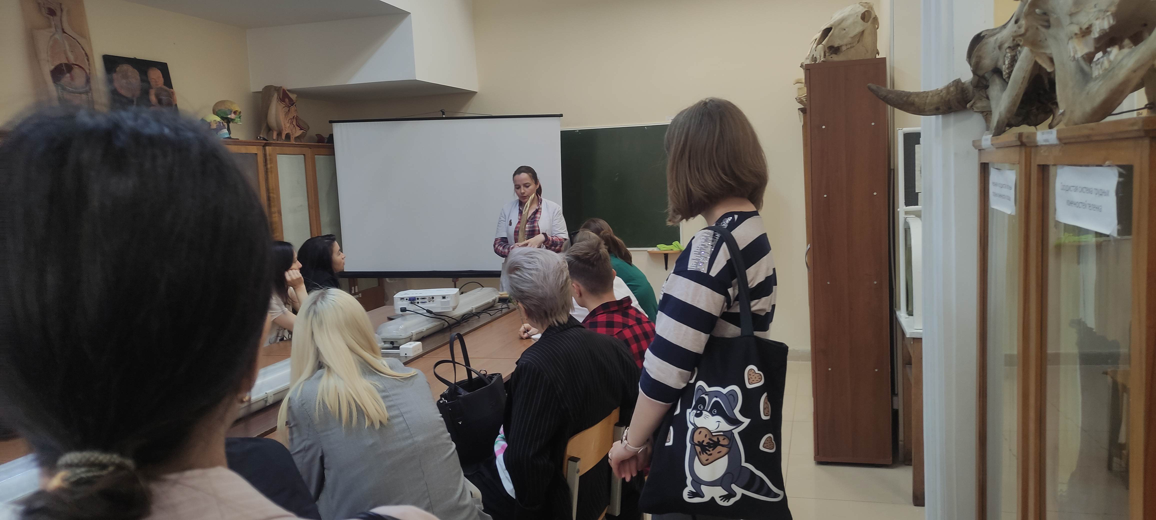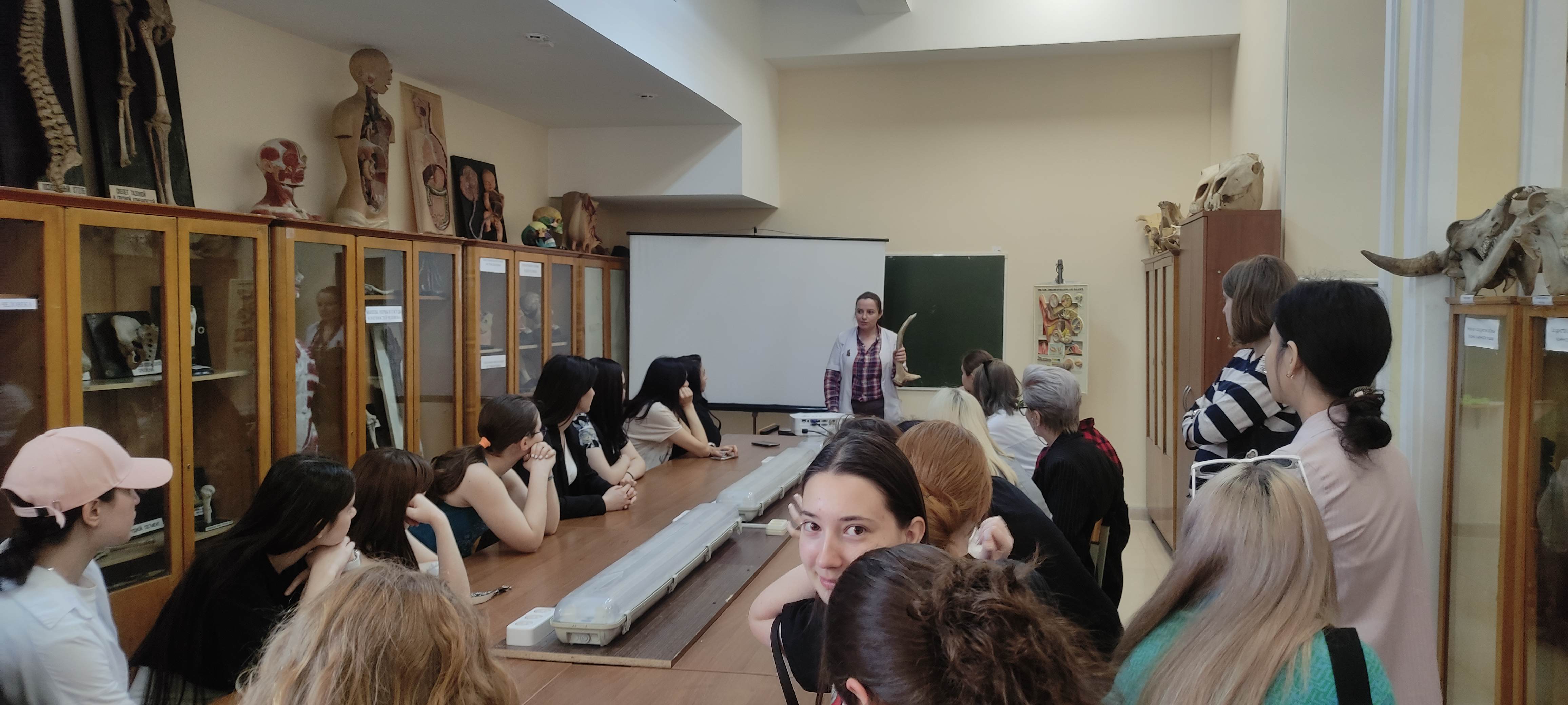 Преподаватели кафедры морфологии и ветеринарно-санитарной экспертизы Беляева Н.П., Кубатбеков Т.С. и Сафонов А.В. рассказали ребятам об основных направлениях подготовки в институте зоотехнии и биологии. В первую очередь, гостей, уже имеющих дело с медициной, заинтересовала направление ветеринарии, но их интерес к ветеринарно-санитарной экспертизе смогли усилить подробные рассказы о ней и экскурсионное занятие. В Музее анатомии им.Б.К. Гиндце студентам рассказали об особенностях анатомического строения животных и провели сравнительную характеристику между анатомией животных и человека.