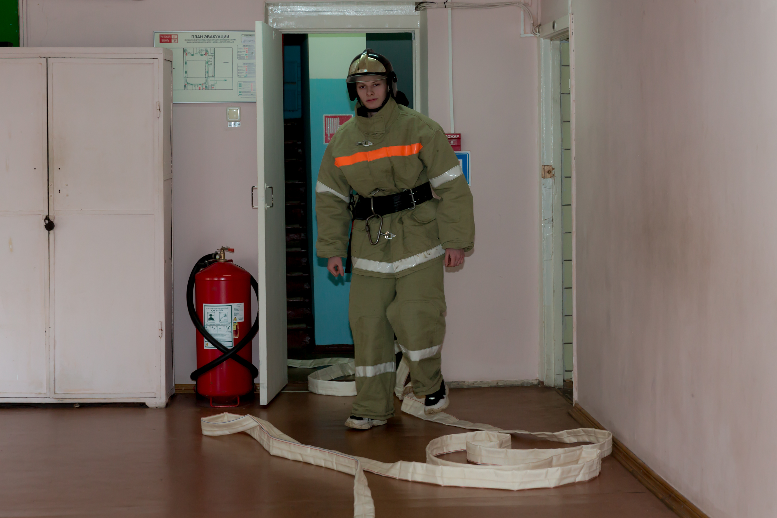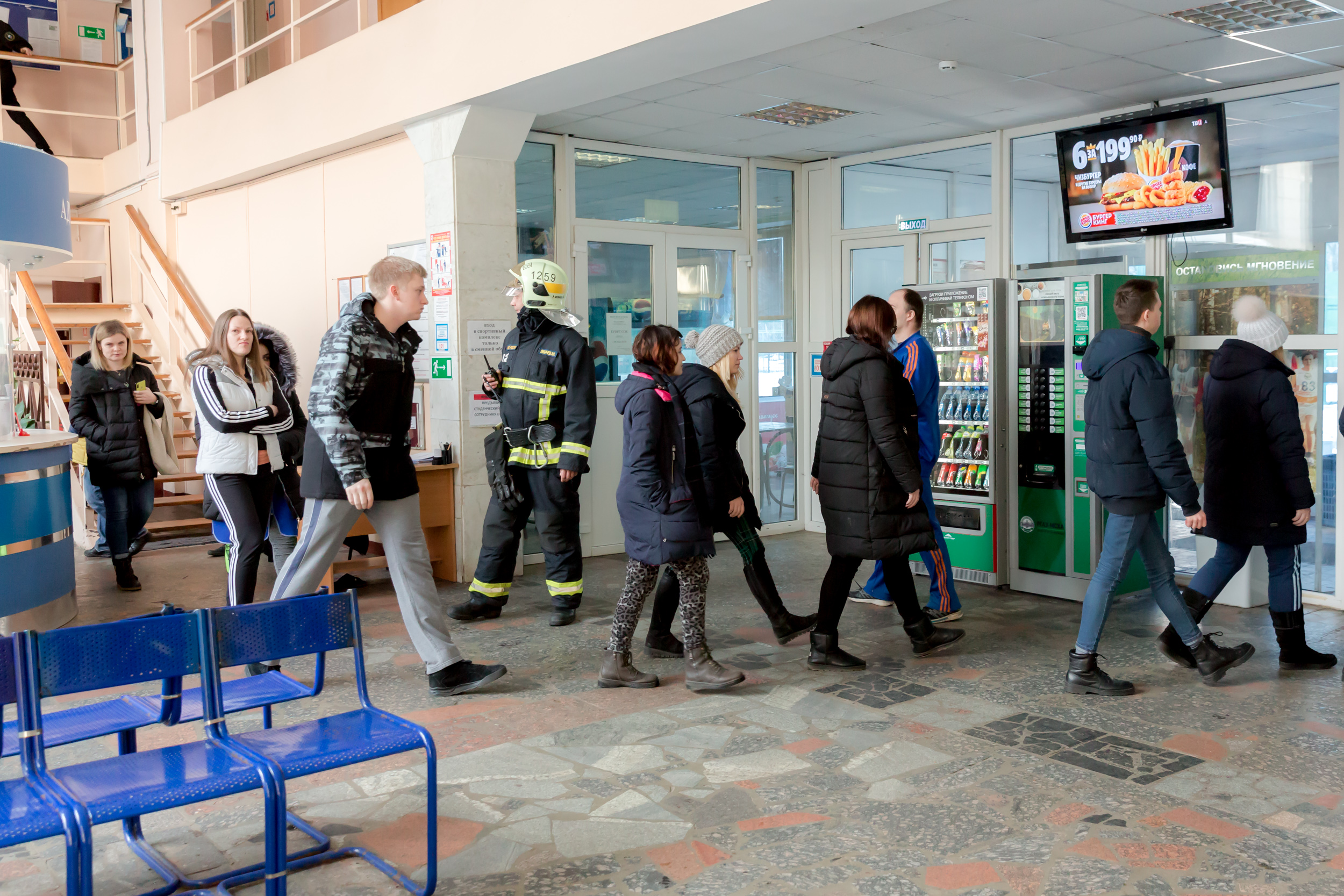 По сценарию учений в объектовую пожарную часть поступило сообщение сотрудника ЧОП о том, что сработала система пожарной сигнализации в раздевалке на втором этаже. Руководство и дежурная смена немедленно отреагировала на поступивший сигнал. Параллельно сработала система оповещения при пожаре и была начата эвакуация людей.
