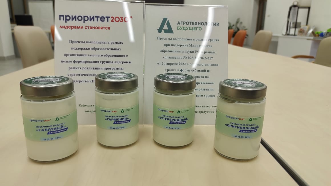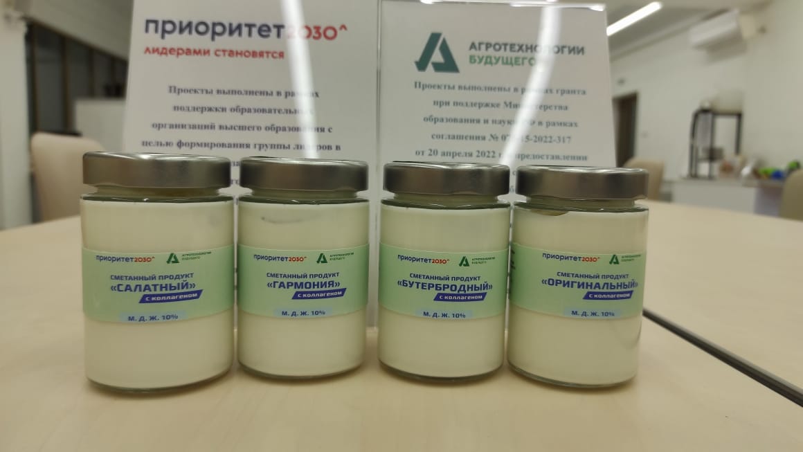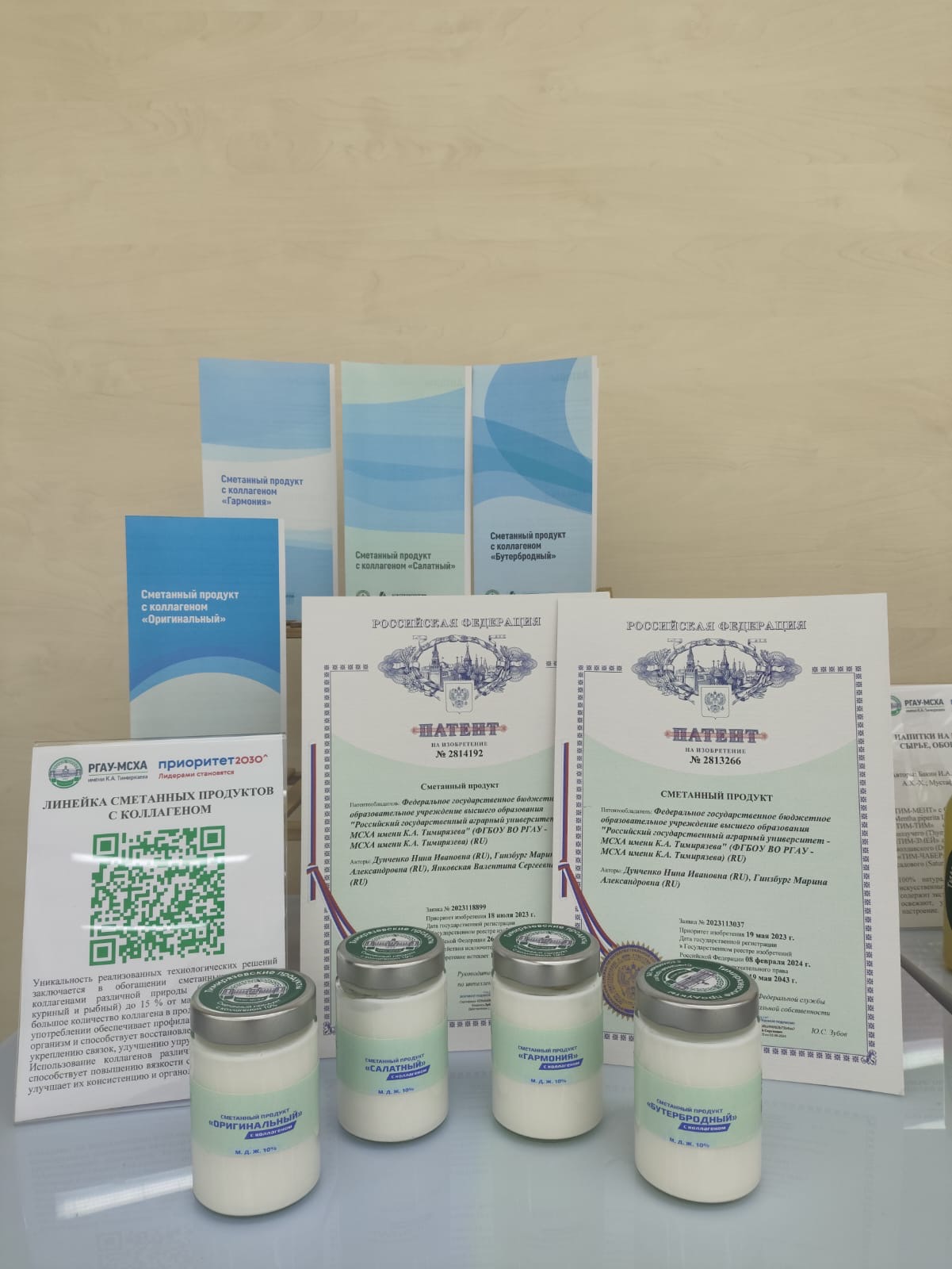 Ученые Тимирязевской академии разработали новые оригинальные рецептуры и технологии производства сметанных продуктов с рациональной дозой внесения коллагенов. Достоинство новой технологии заключается в сокращении цикла производства примерно в 2 раза по сравнению с традиционной схемой производства сметаны, что способствует снижению себестоимости готовой пищевой продукции, а также улучшению ее качеств. Использование коллагенов позволяет вырабатывать продукт без стадии созревания, так как на этапе сквашивания при температуре 37±1°С в течение 7-13 часов уже образована структура за счет кислотной коагуляции и внесения коллагенов. Оригинальные сметанные продукты с коллагенами водного и наземного генеза разработаны на кафедре Управления качеством и товароведения продукции Технологического института и запатентованы Тимирязевской академией.