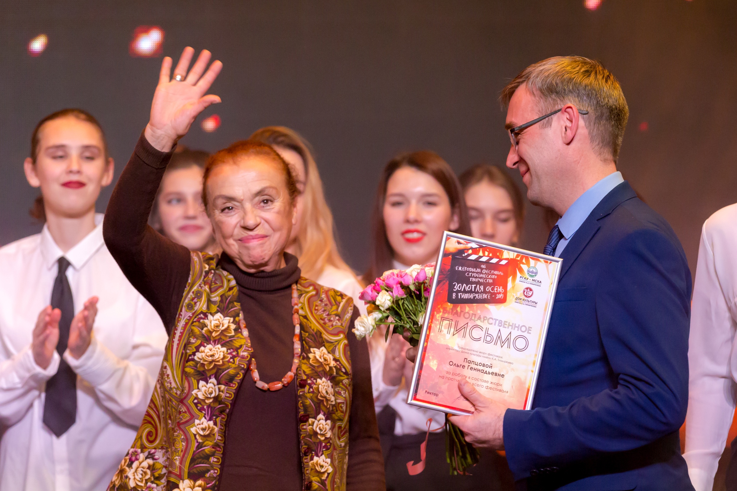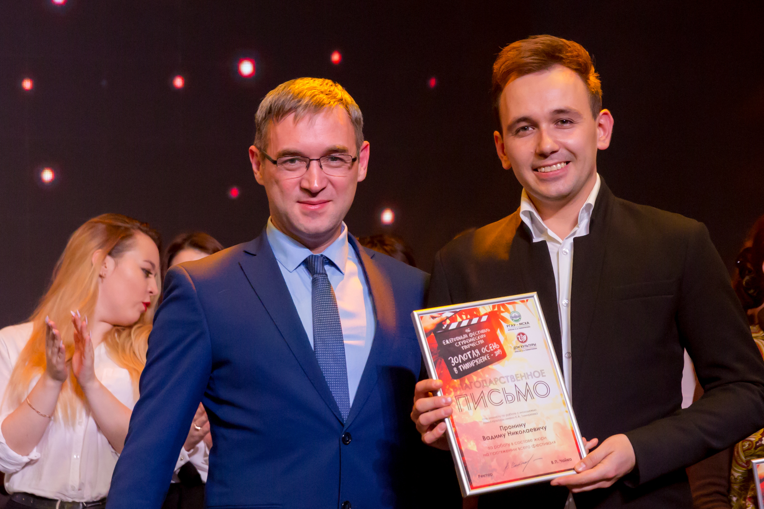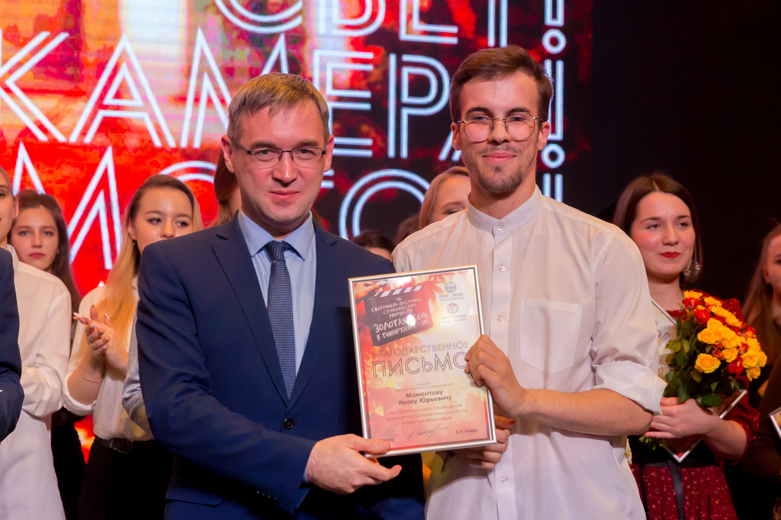 Членам жюри - директору ДК Ольге Папцовой, режиссеру Антону Володину, руководителю фольклорного ансамбля «Беседы» Ирине Сафоновой, руководителю вокальной студии Sound Family Кристине Солодковой, специалисту Центра досуга студентов Вадиму Пронину, а также главному культоргу университета Олегу Марусию и культоргам институтов и факультетов за отличную организацию гала-концерта объявлены благодарности ректора Тимирязевки.