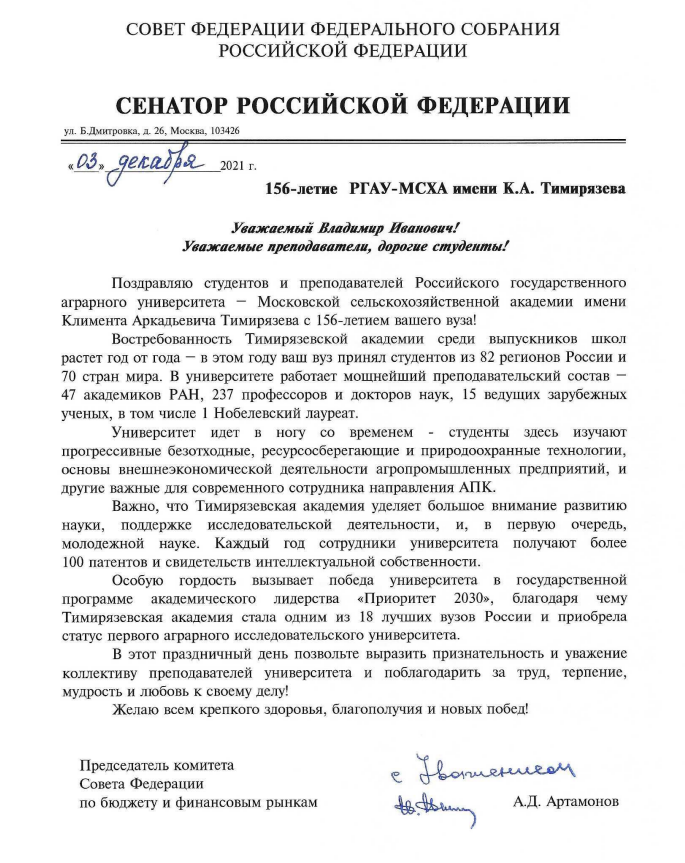 Теплые слова поздравления в связи со 156-летием РГАУ-МСХА имени К.A. Тямирязева направил Председатель комитета Совета Федерации по бюджету и финансовым рынкам, почетный выпускник университета Анатолий Дмитриевич Артамонов.