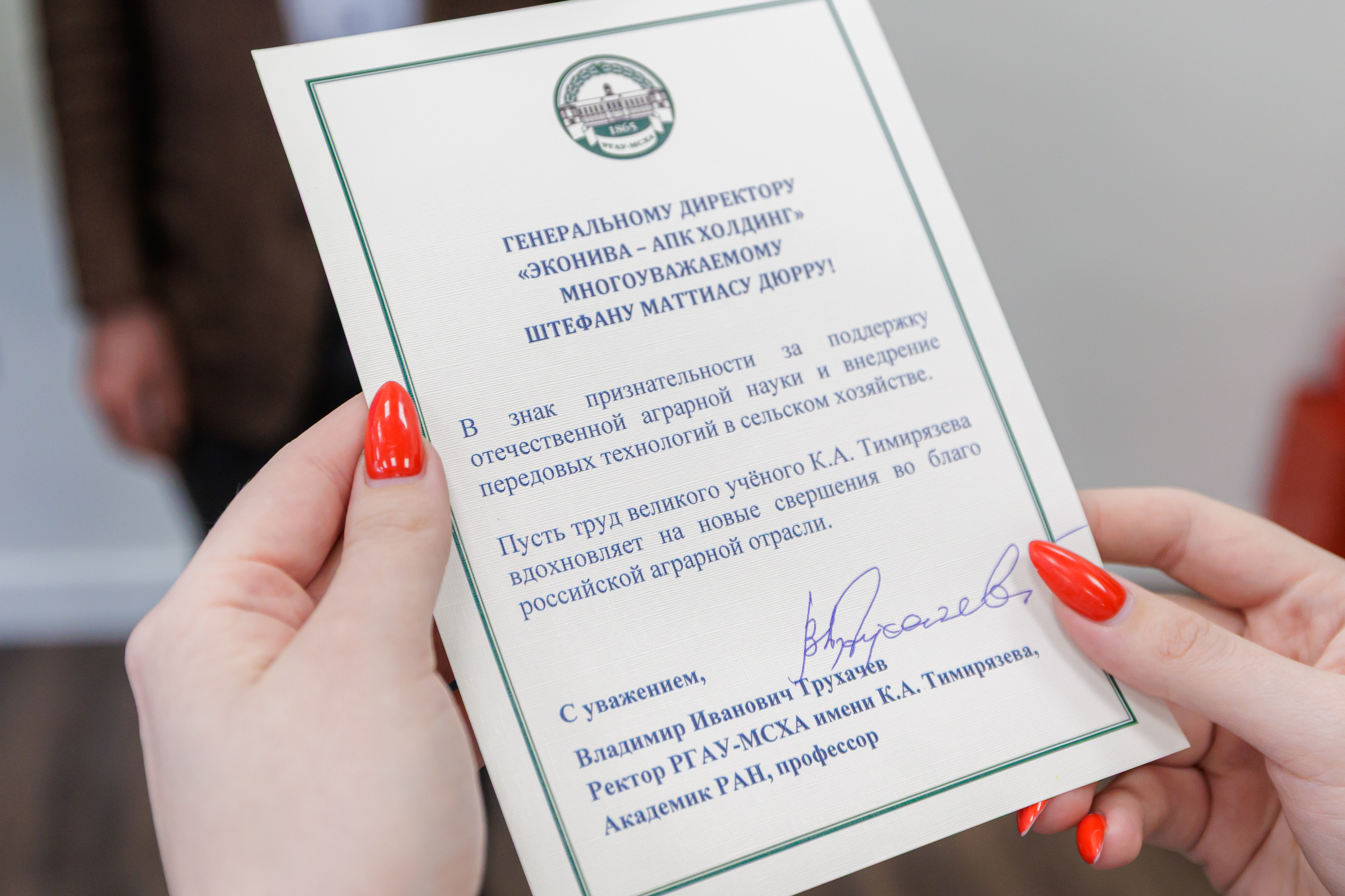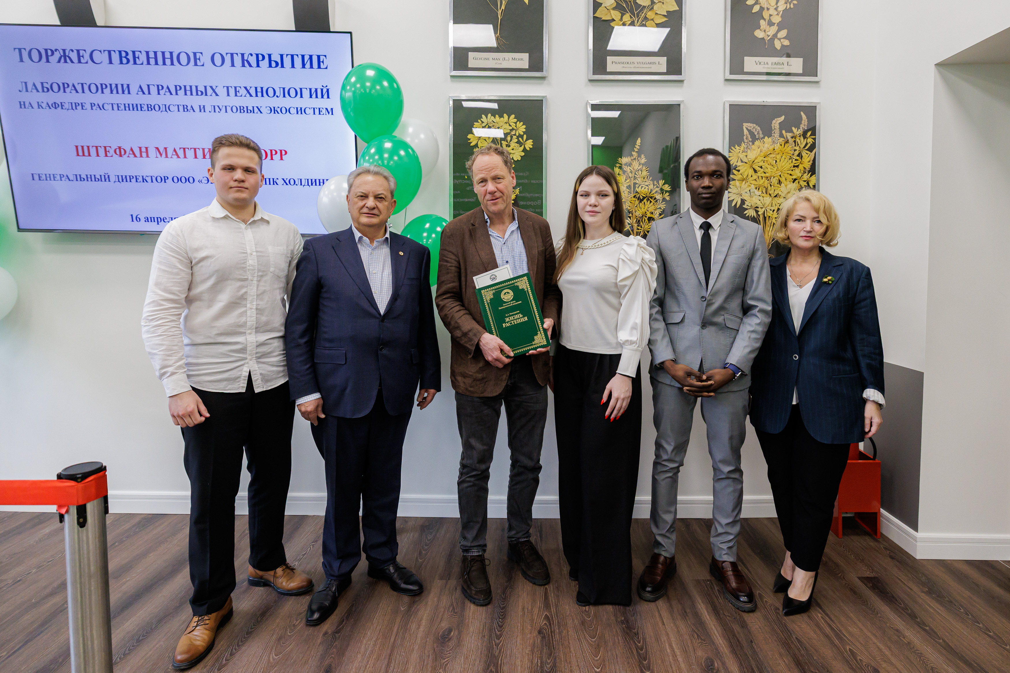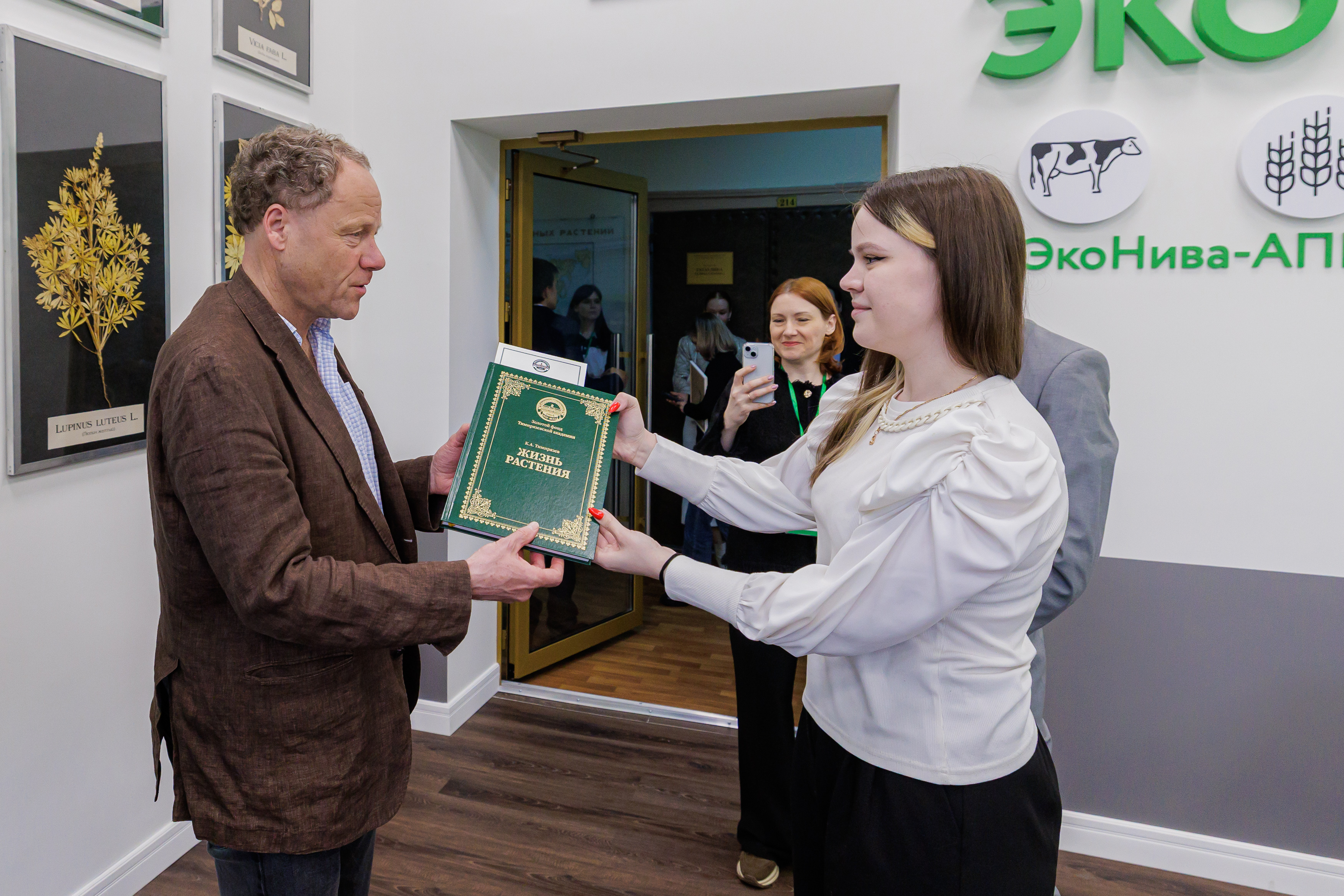 В рамках торжественной церемонии открытия аудитории, после традиционного разрезания красной ленточки, студенты Института агробиотехнологии преподнесли генеральному директору «ЭкоНивы» Штефану Дюрру уникальное издание книги Климента Аркадьевича Тимирязева «Жизнь растений». Этот символический подарок подчеркнул связь поколений и преемственность научных традиций.