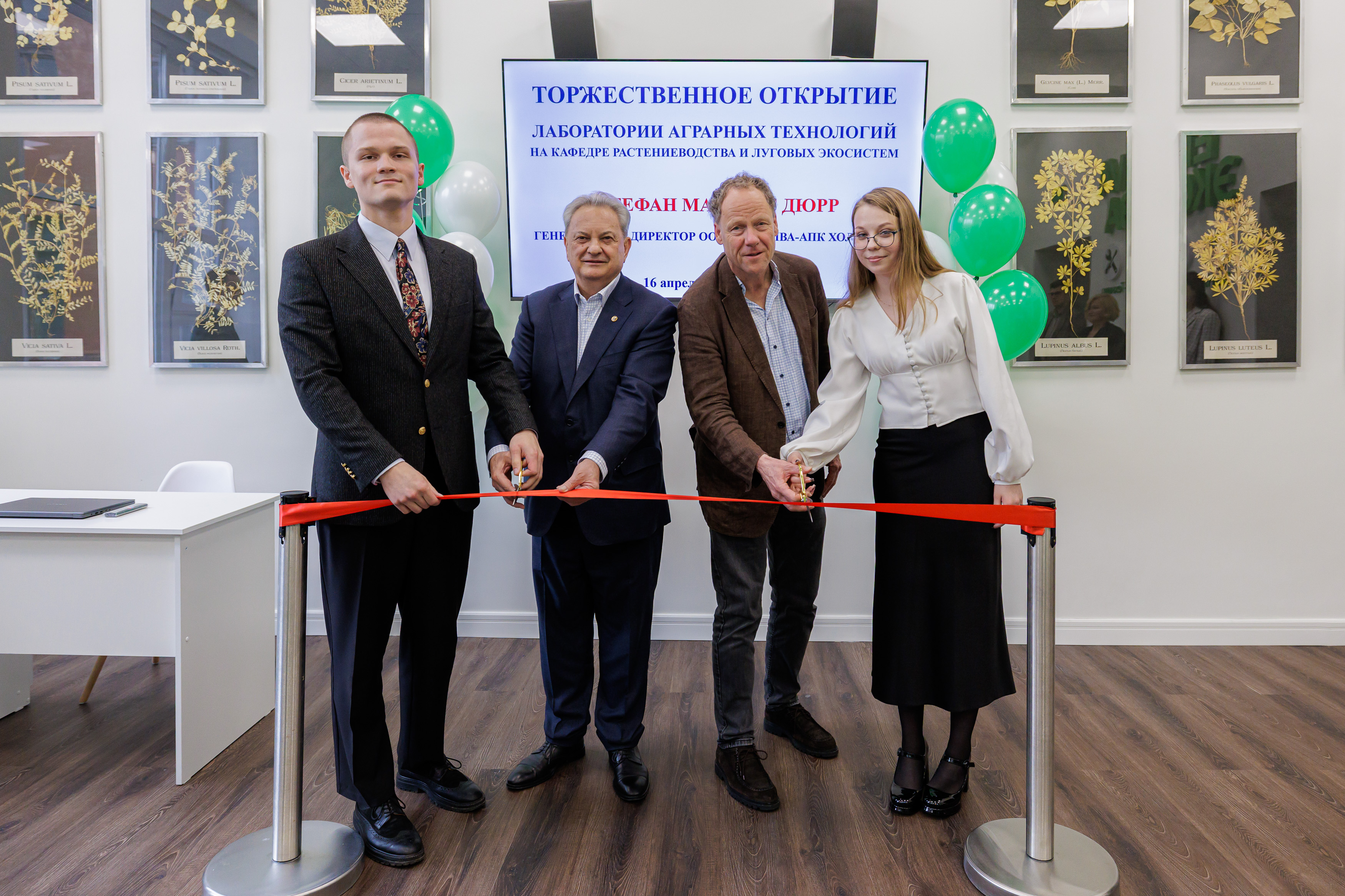Аудиторию открыли: ректор РГАУ - МСХА имени К.А. Тимирязева, Академик РАН, профессор Владимир Трухачев, основатель и президент группы компаний "ЭкоНива" Штефан Дюрр и студенты Инстиутта агробиотехнологии.