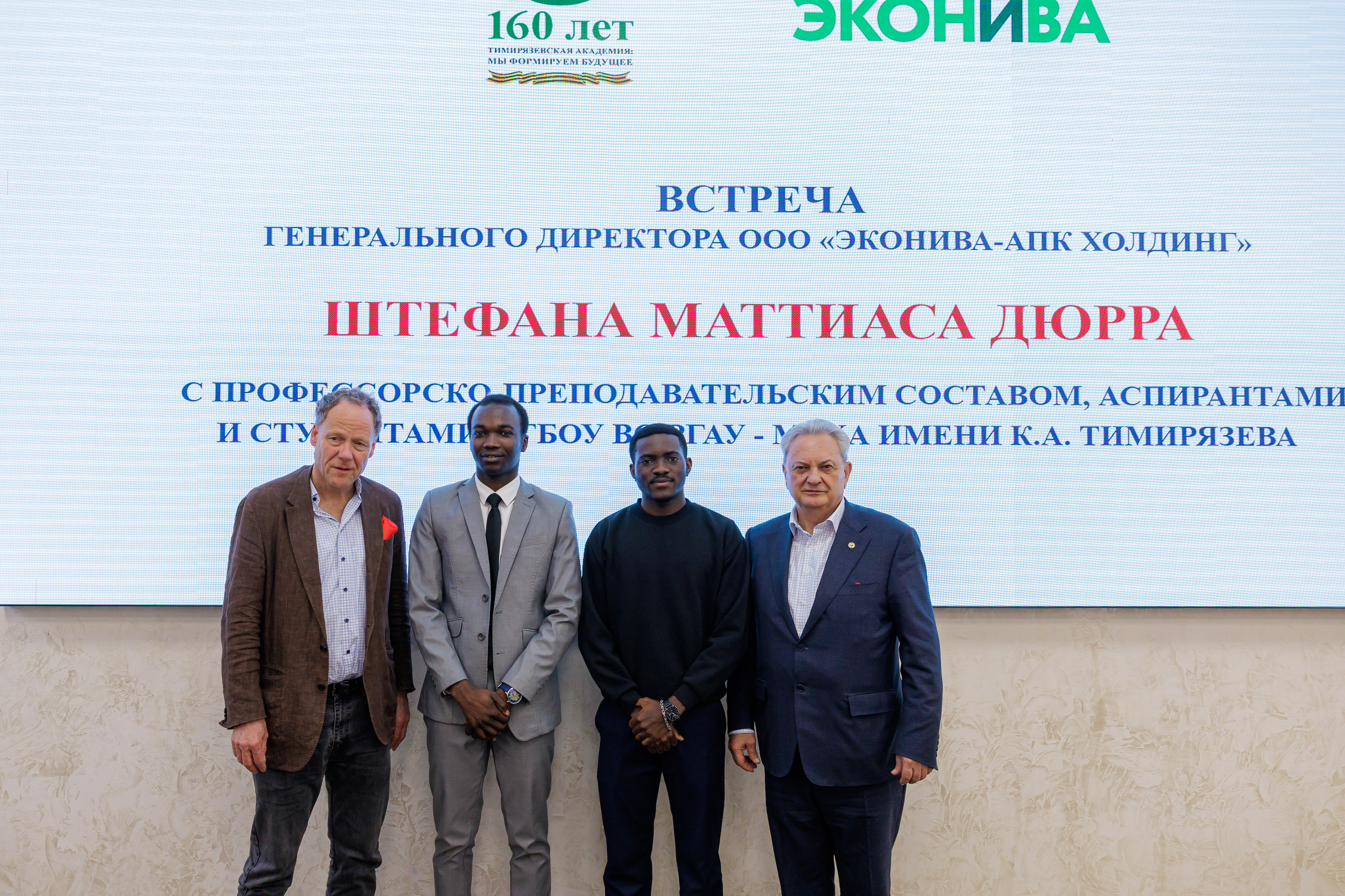 В Российском государственном аграрном университете – МСХА имени К.А. Тимирязева состоялось торжественное открытие брендированной аудитории компании «ЭкоНива» в Институте агробиотехнологии. Это событие знаменует собой новый этап плодотворного сотрудничества между ведущим аграрным вузом страны и одним из лидеров агропромышленного комплекса. Почетным гостем стал основатель и президент группы компаний "ЭкоНива" Штефан Дюрр.