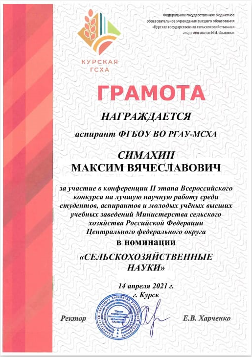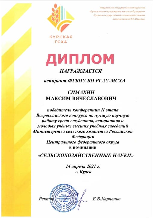 Аспирант кафедры декоративного садоводства и газоноведения Симахин Максим Вячеславович стал победителем II этапа Всероссийского конкурса на лучшую научную работу среди студентов, аспирантов и молодых ученых высших учебных заведений Министерства сельского хозяйства Российской Федерации Центрального Федерального округа в номинации "Сельскохозяйственные науки" (научный руководитель Тазина С.В.- к.б.н., доцент, и.о. зав.кафедрой декоративного садоводства и газоноведения).
