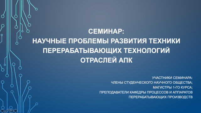 На кафедре процессов и аппаратов перерабатывающих производств Технологического института 16 ноября прошел семинар «Научные проблемы развития техники перерабатывающих технологий отраслей АПК». В семинаре приняли участие члены студенческого научного общества (СНО), магистры и преподаватели кафедры процессов и аппаратов перерабатывающих производств.