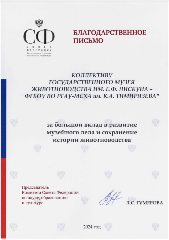 Коллектив РГАУ-МСХА имени К.А. Тимирязева удостоен Благодарственного Письма Совета Федерации. За большой вклад в музейное дело и сохранение животноводческой науки отдельно отмечен Государственный музей животноводства имени Е.Ф. Лискуна.