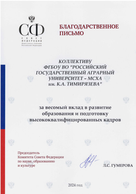 14 Декабрь / 2024«Коллективу ФГБОУ ВО «Российский государственный аграрный университет – МСХА имени К.А. Тимирязева» за весомый вклад в развитие образования и подготовку квалифицированных кадров», - говорится в Благодарственном Письме за подписью председателя Комитета Совета Федерации по науке, образованию и культуре Лилии Салаватовны Гумеровой.