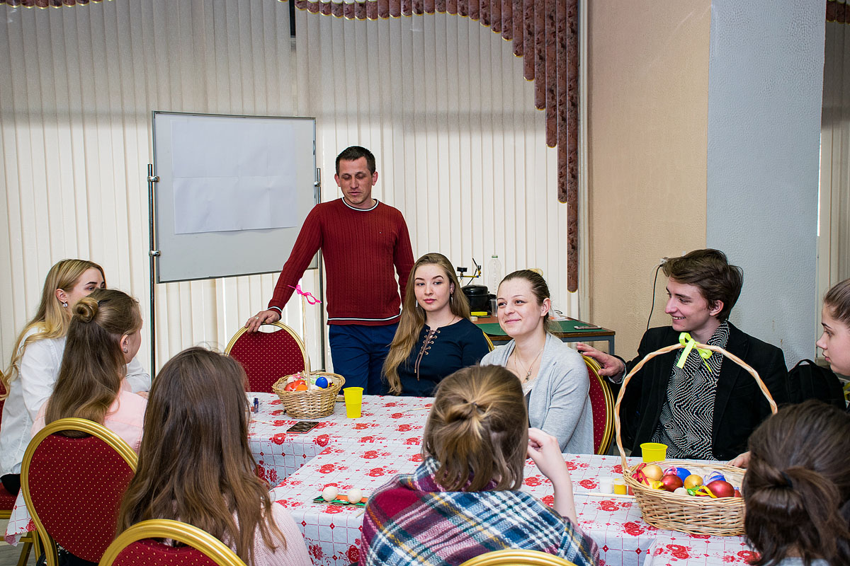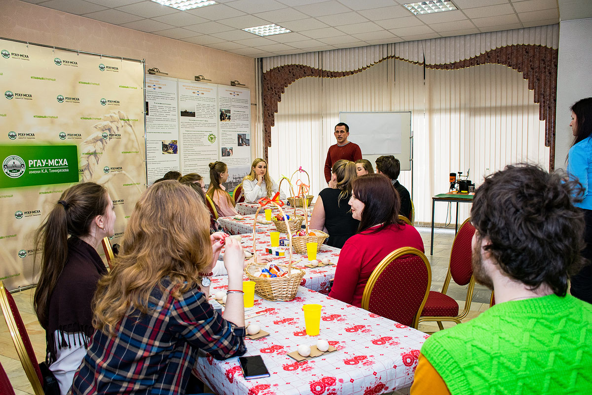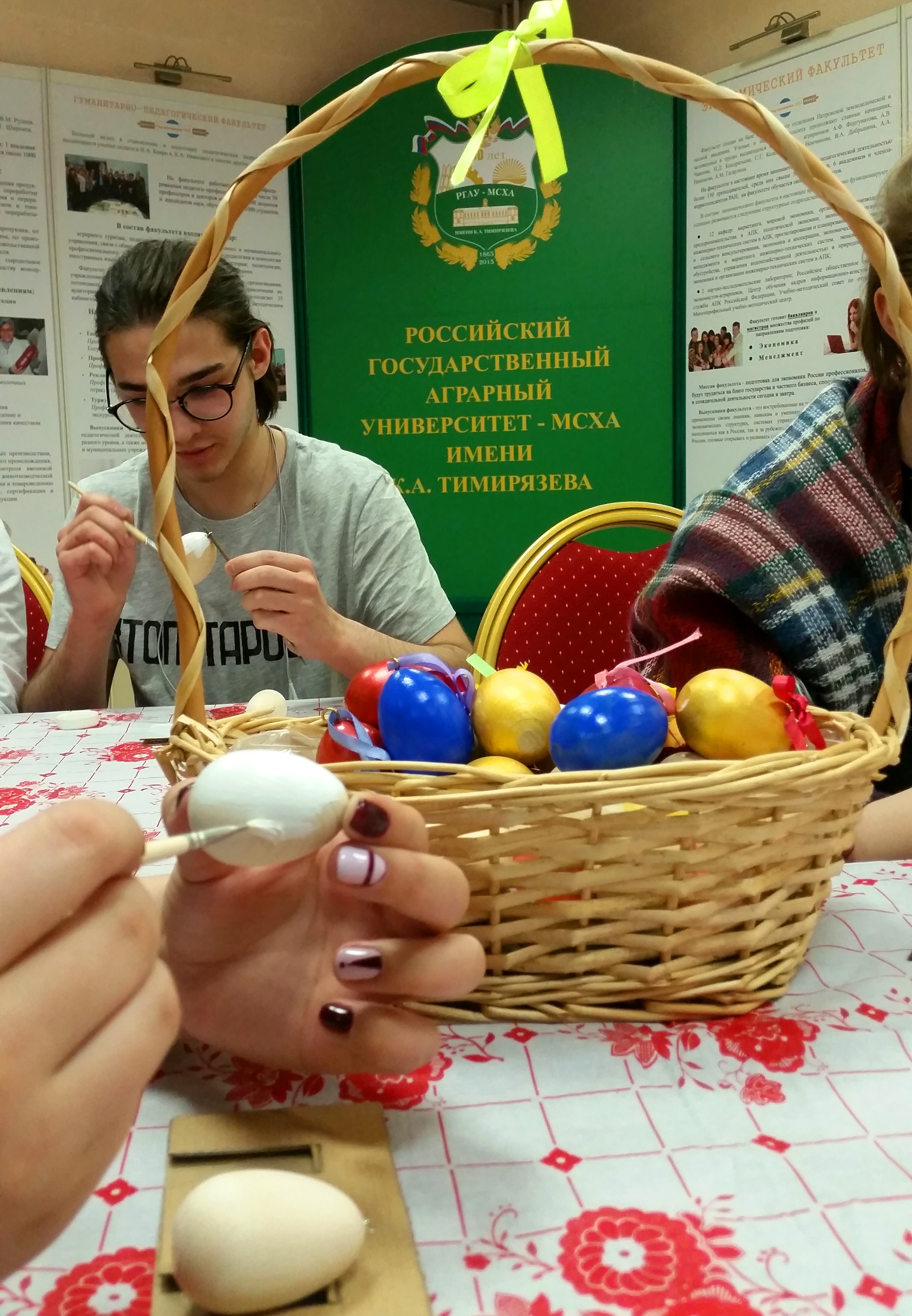 06 Апрель / 2018В этом году Великий (чистый) четверг православные христиане отмечают 5 апреля. В этот день, по традиции, верующие начинают активную подготовку к празднику: пекут куличи, красят яйца, убирают жилище. В Тимирязевке тоже есть свои пасхальные традиции: в этот день студенты украшают яблоню у храма священномученика Иоанна Артоболевского сувенирными пасхальными яйцами, выполненными собственными руками. Основы росписи, приемы и техники декорирования студентам продемонстрировал специалист по работе с молодёжью Управления по воспитательной работе Алексей Ткач. Таинственное звёздное небо, цветущий весенний сад и логотип Тимирязевки он изобразил несколькими быстрыми штрихами обычной губкой для мытья посуды. Причем, получилось это одинаково виртуозно и на широкой маркерной доске, и на небольшом сувенирном яйце.