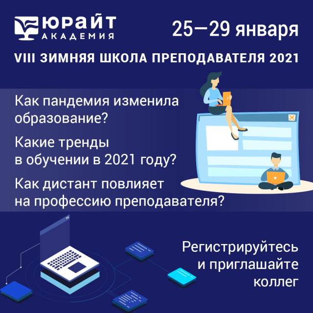 Зимняя школа преподавателя-2021 объединяет в себе форматы научно-практической конференции, курсов повышения квалификации и обзора самых актуальных трендов в образовании. Организатором международного онлайн-интенсива выступает Образовательная платформа «Юрайт», объединяющая возможности образовательного ресурса, электронной библиотеки и интернет-магазина, в котором представлены электронные и печатные учебники авторов — преподавателей ведущих университетов для всех уровней профессионального образования, а также видео- и аудиоматериалами.