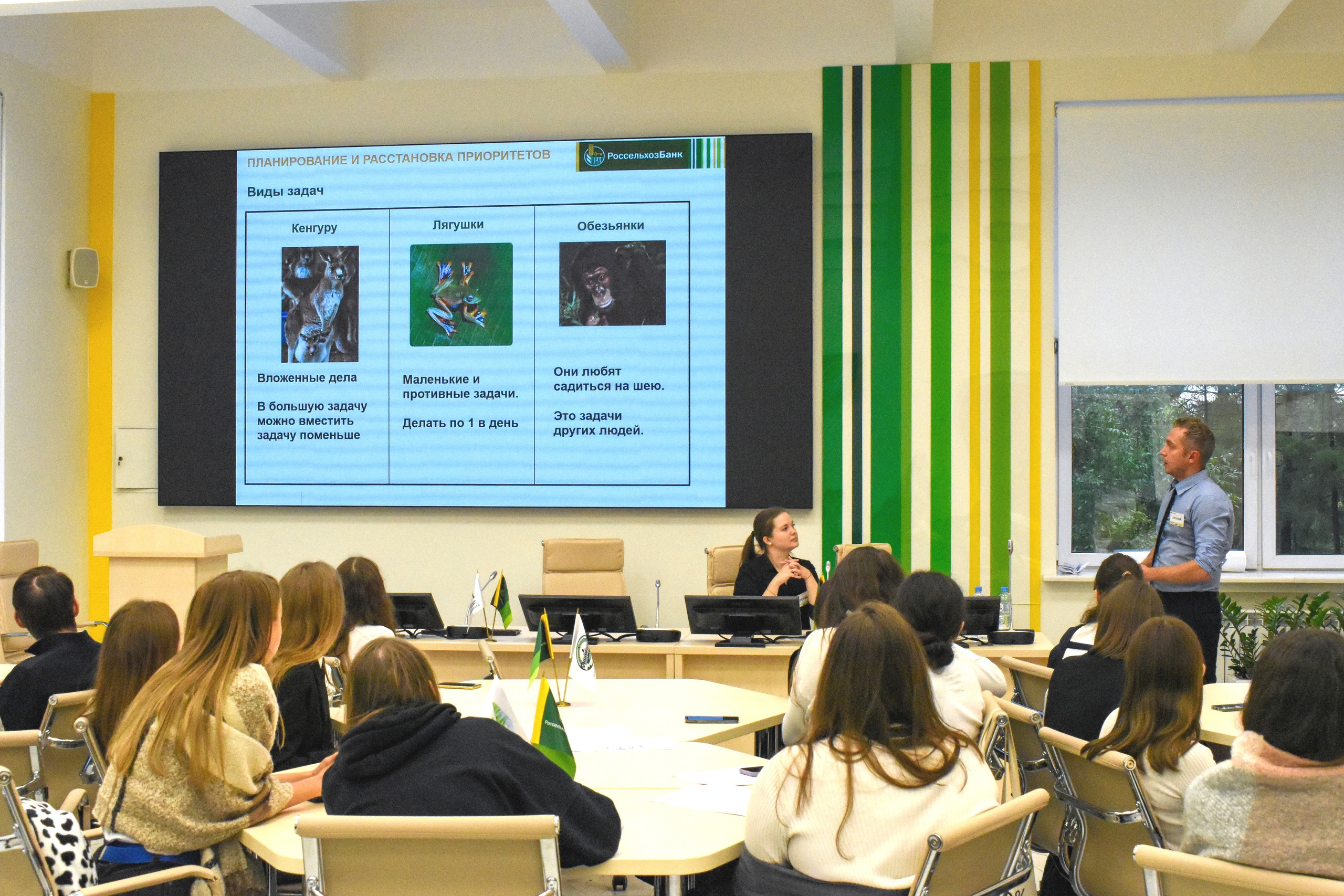 Мастер-класс провели главные специалисты отдела учебно-методического сопровождения Департамента по работе с персоналом АО «Россельхозбанк» Евгений Анатольевич Козаков и Екатерина Николаевна Кивелевич. Они рассказали об организации личного времени, грамотном планировании дел, постановке целей на краткосрочные и долгосрочные периоды.