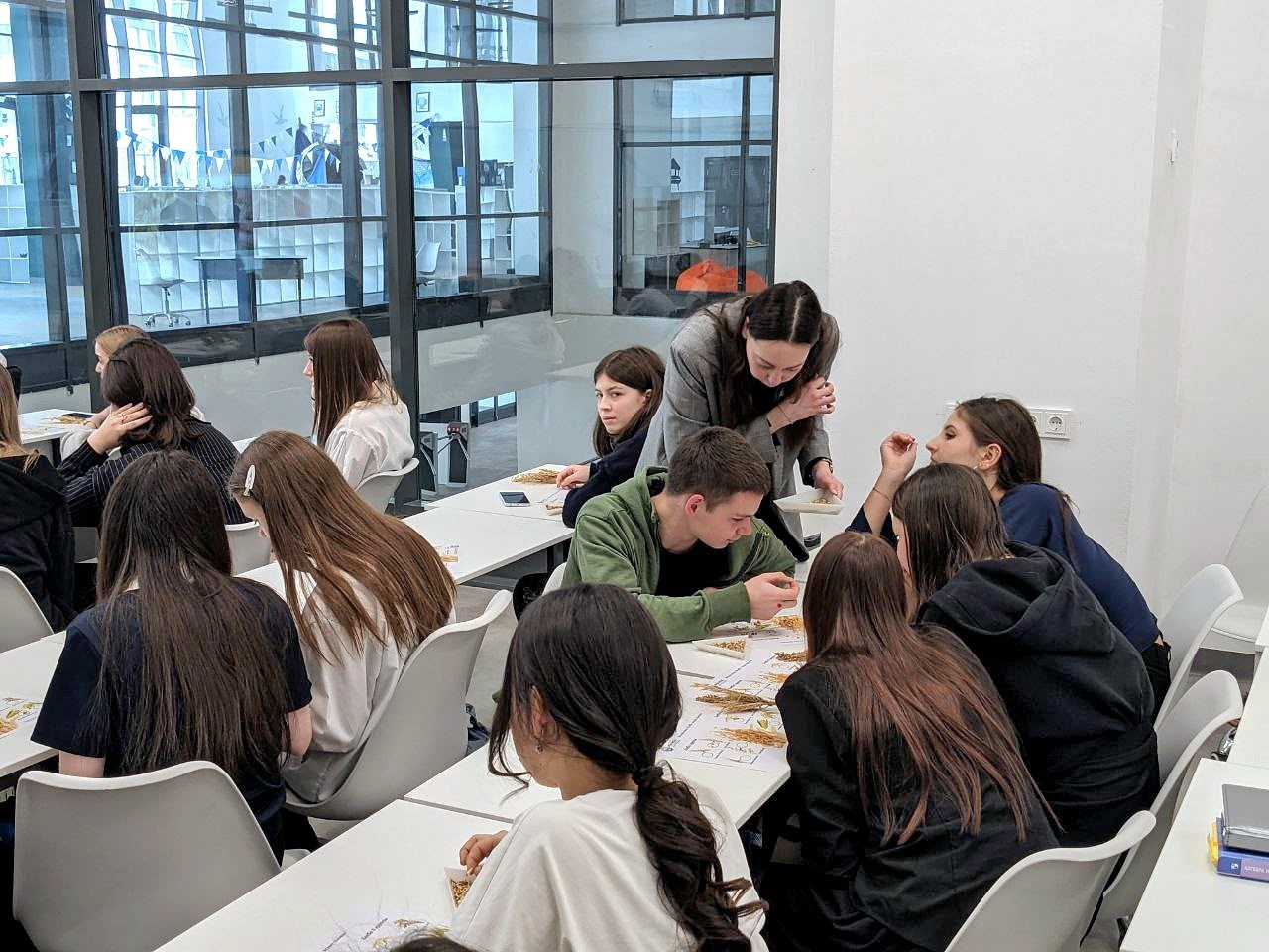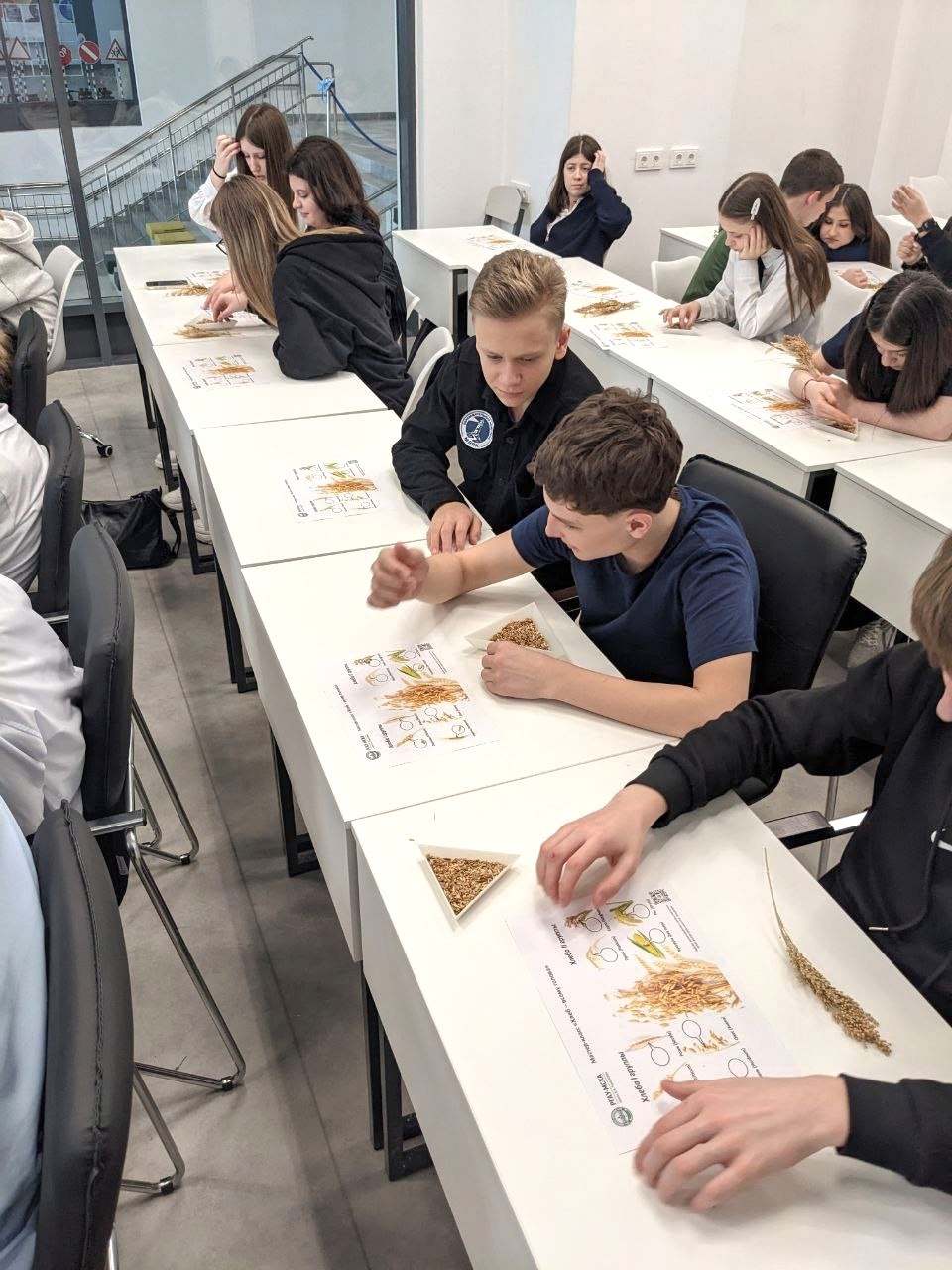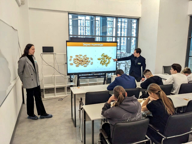 Затем молодые ученые Анастасия Поварницына и Владимир Вильховой, провели мастер-класс для учащихся 9 класса. Они познакомили ребят с основными зерновыми культурами отечественного и мирового растениеводства. Школьники получили практические навыки распознавания культур по зерну и соцветиям, а также узнали, какие продукты производятся из этих культур, что вызвало активный интерес.