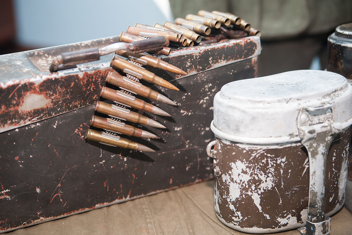 На немецком стенде тоже были представлены редкие предметы - противогазный футляр и штык-нож к карабинам системы Маузера. Футляр не успел заржаветь за семь десятилетий, его обнаружили в землянке, а штык-нож никогда не использовали – на нем даже осталась заводская смазка.